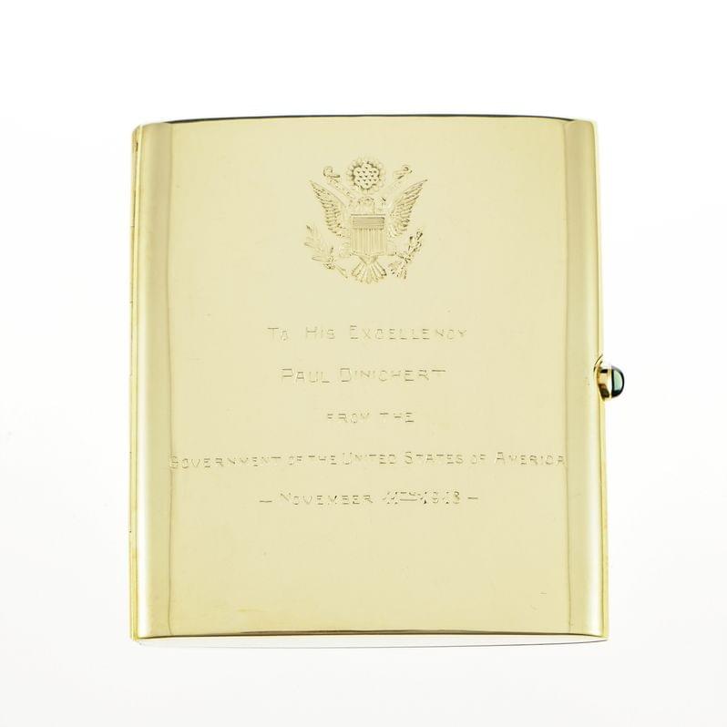 352. Boîte à cigarettes gravée du grand sceau des Etats-Unis d'Amérique présentée à l'occasion de l'armistice de la 1ère guerre mondiale et dédicacée "To His Excellency Paul Dinichert from the Government of the United States of America - November 11th 1918", poussoir serti d'un saphir en cabochon