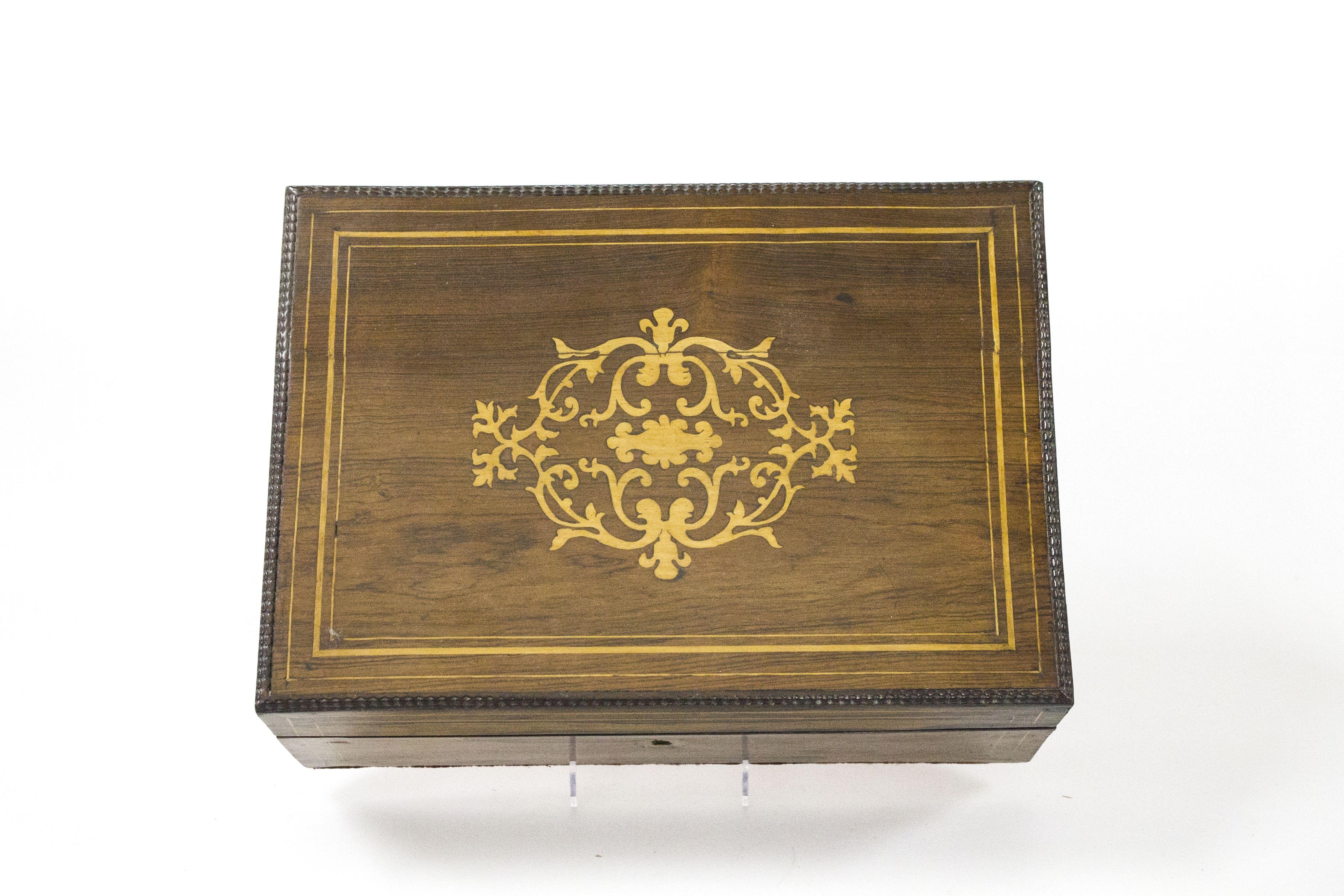 Palissandre marqueté de filets de bois clair, 13x33x22 cm. Collection B. de Saussure