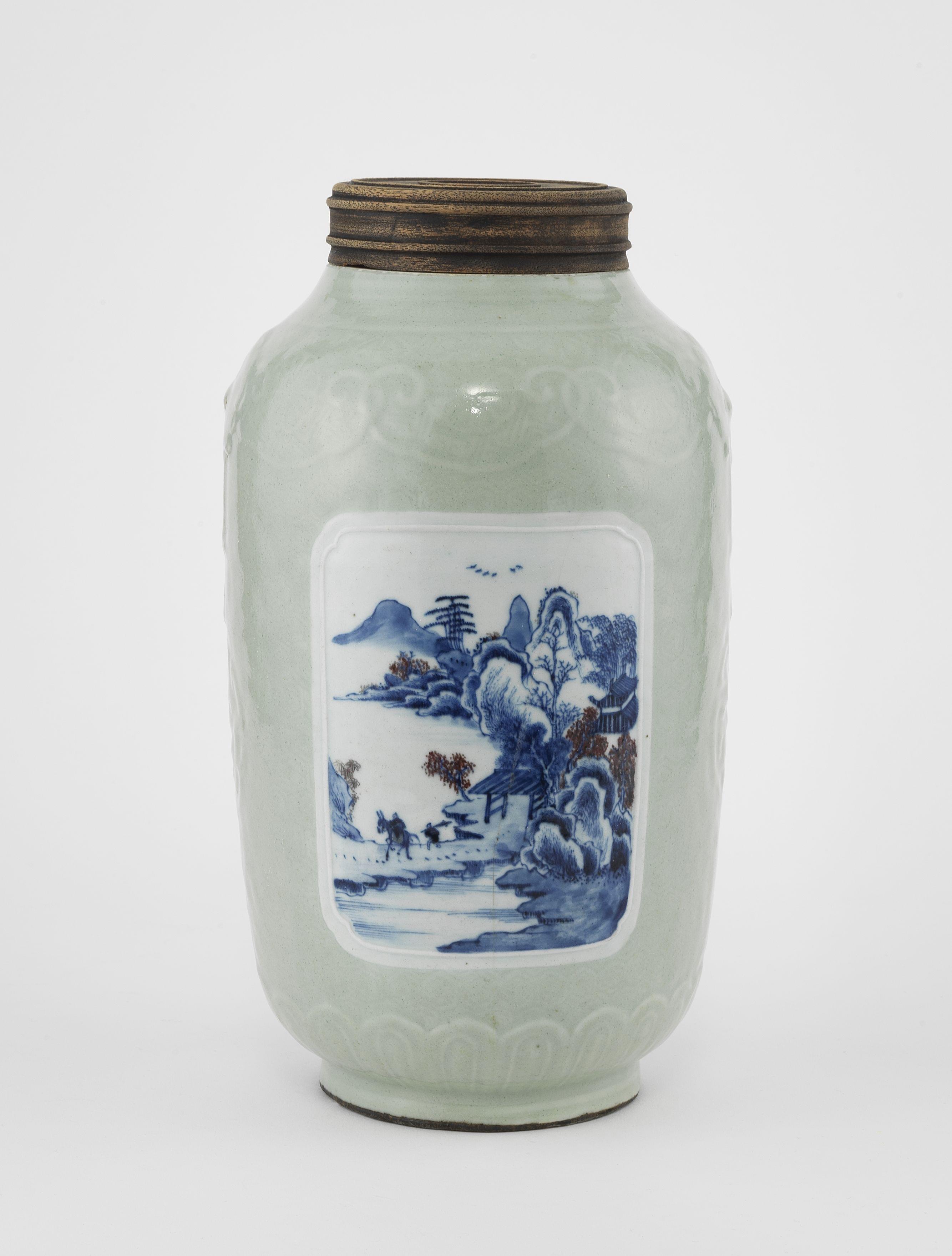 Porcelaine émaillée céladon à décor de paysage en réserve, H 32 cm
