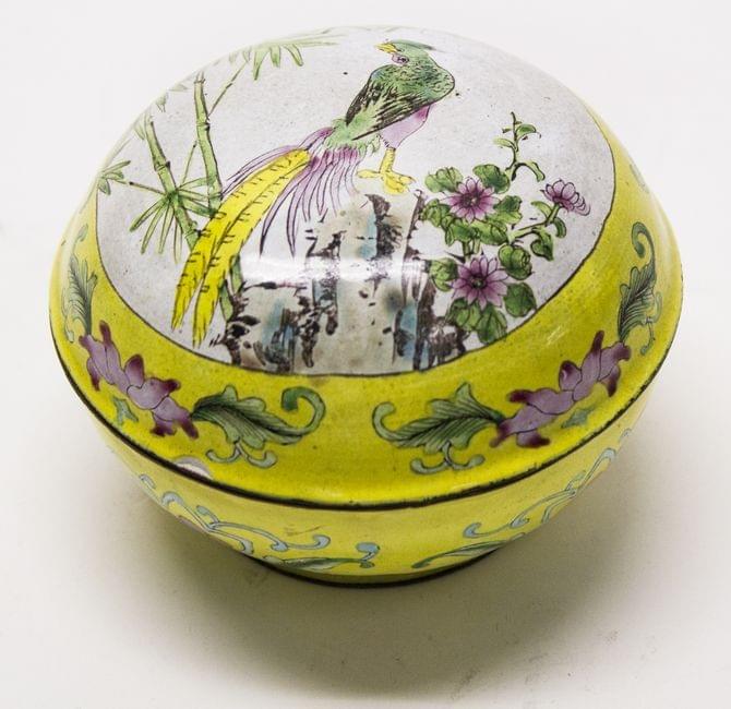 Cuivre émaillé à décor de volatiles en réserve sur fond jaune, Chine, Canton, XIXe s, D 9 cm