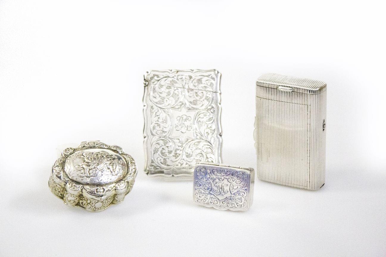 3300. Boîte godronnée formant étui à cigarettes et allumettes, étui à cartes de visite gravé de rinceaux, boite à pilules gravée de rinceaux et boîte polylobée décorée de putti