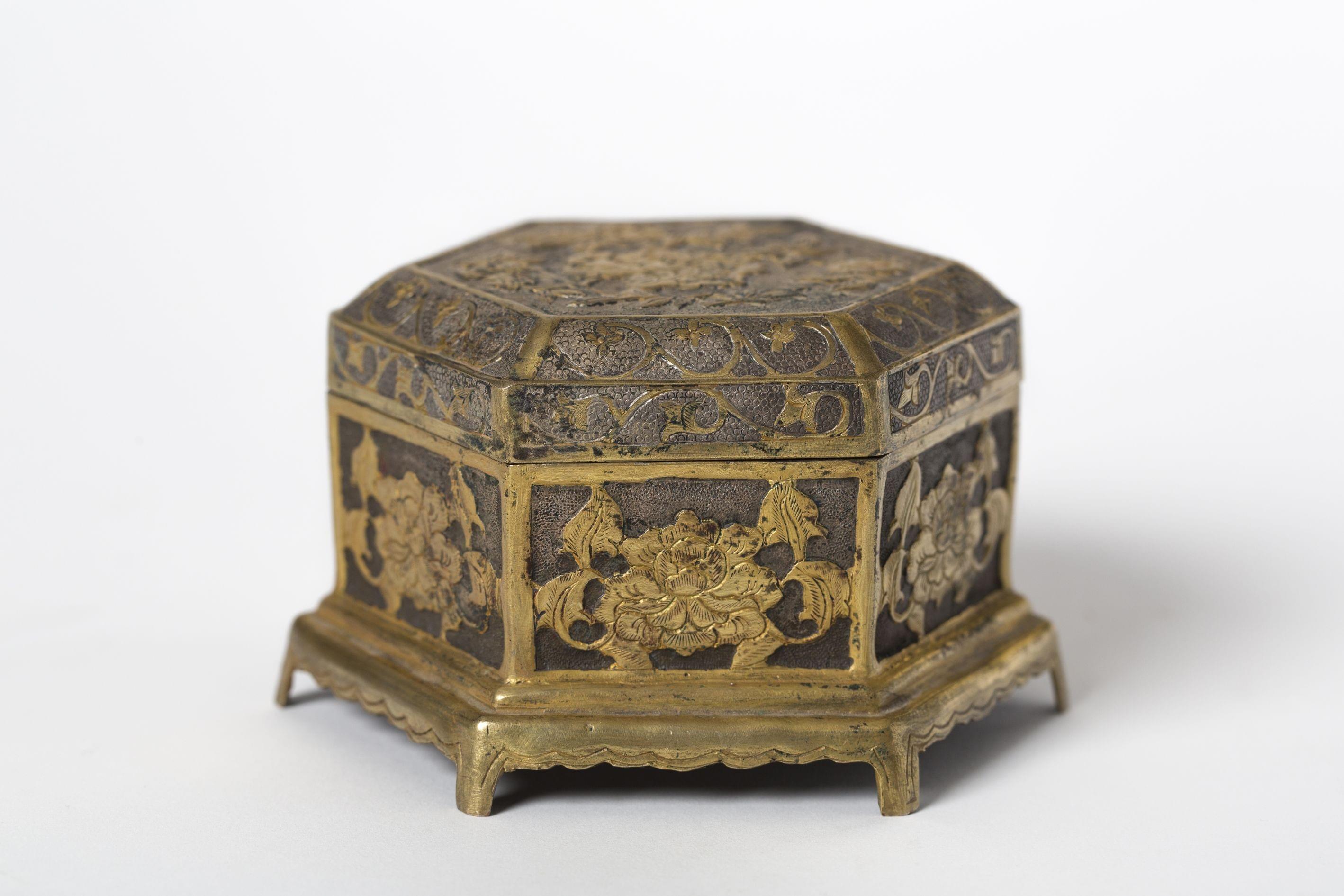 Orné de bustes de Céphale et Adonis, laiton et émaux, H 10 cm