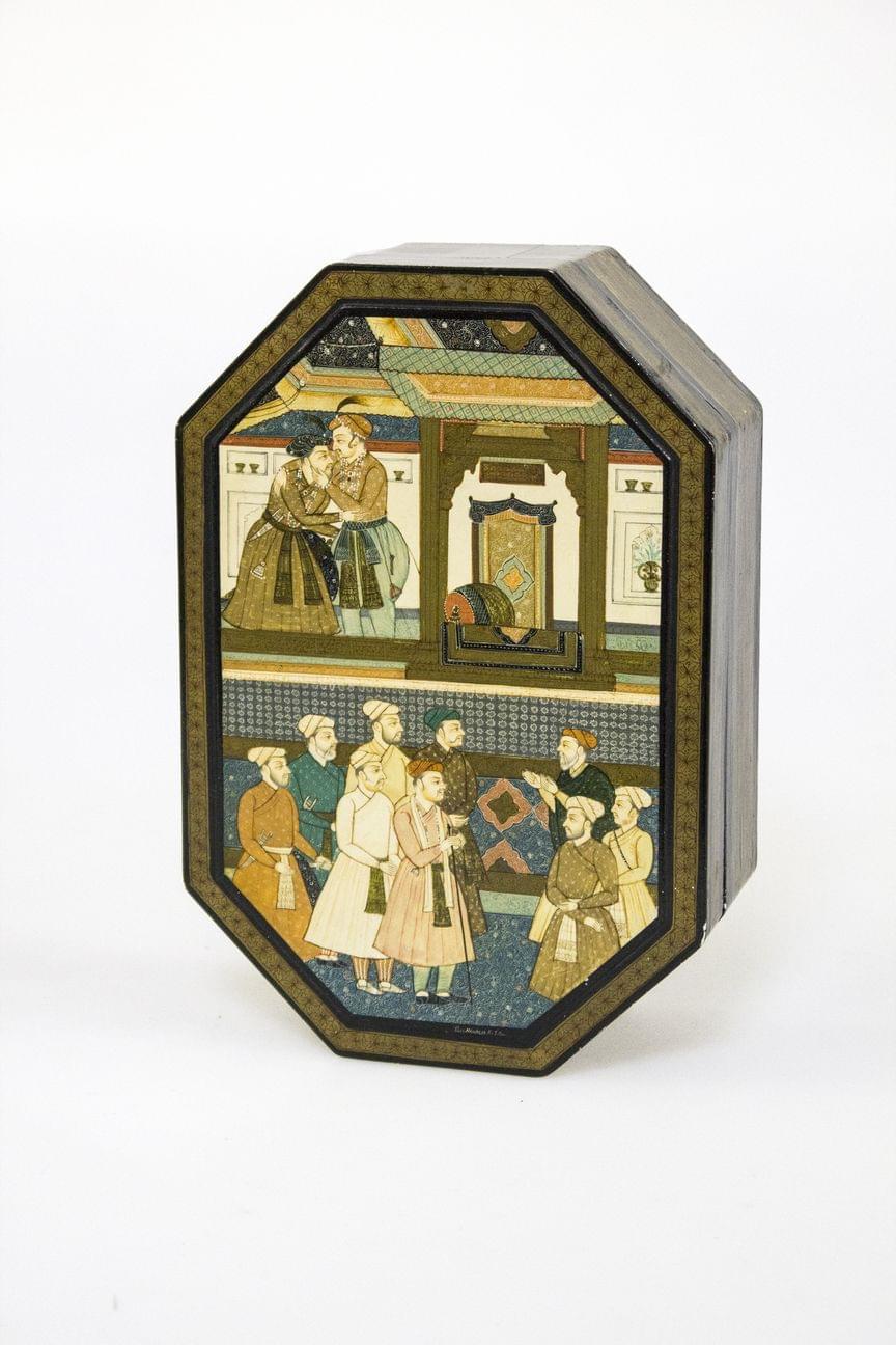 366. Boîte ronde à décor d'une scène animée au bord d'un lac