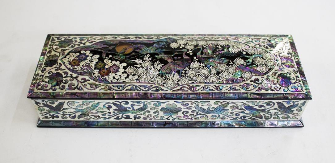 Laque noire incrustée de nacre à décor de volatiles, Corée, XXe s, 4x23x8 cm