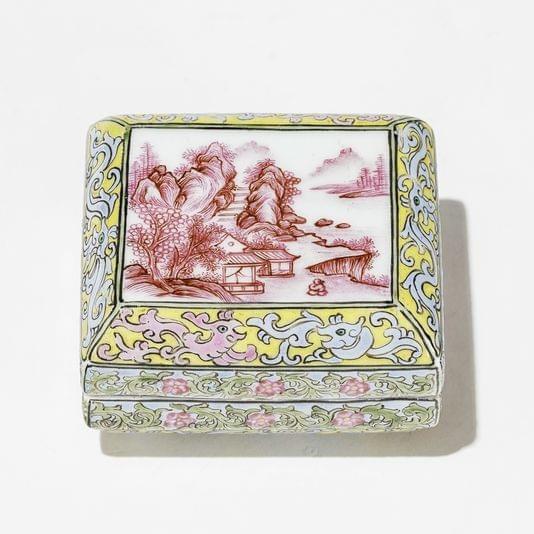 Porcelaine polychrome à décor d'un paysage, marque apocryphe, 9x8x5,5 cm