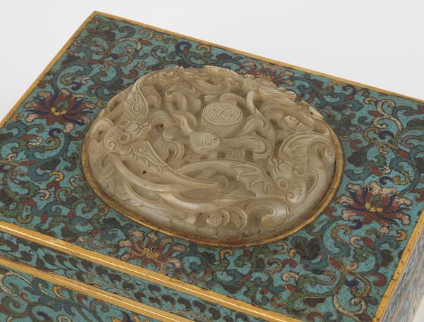 Cuivre et émaux polychromes, couvercle à décor d'un médaillon de jade à motif de chauves-souris, 7x16x12 cm