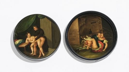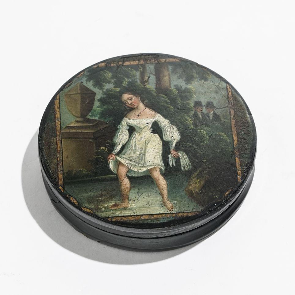 367. Boîte ronde à décor de jeune femme se rafraîchissant les pieds dans un bassin, l'intérieur à secret masquant deux scènes érotiques,