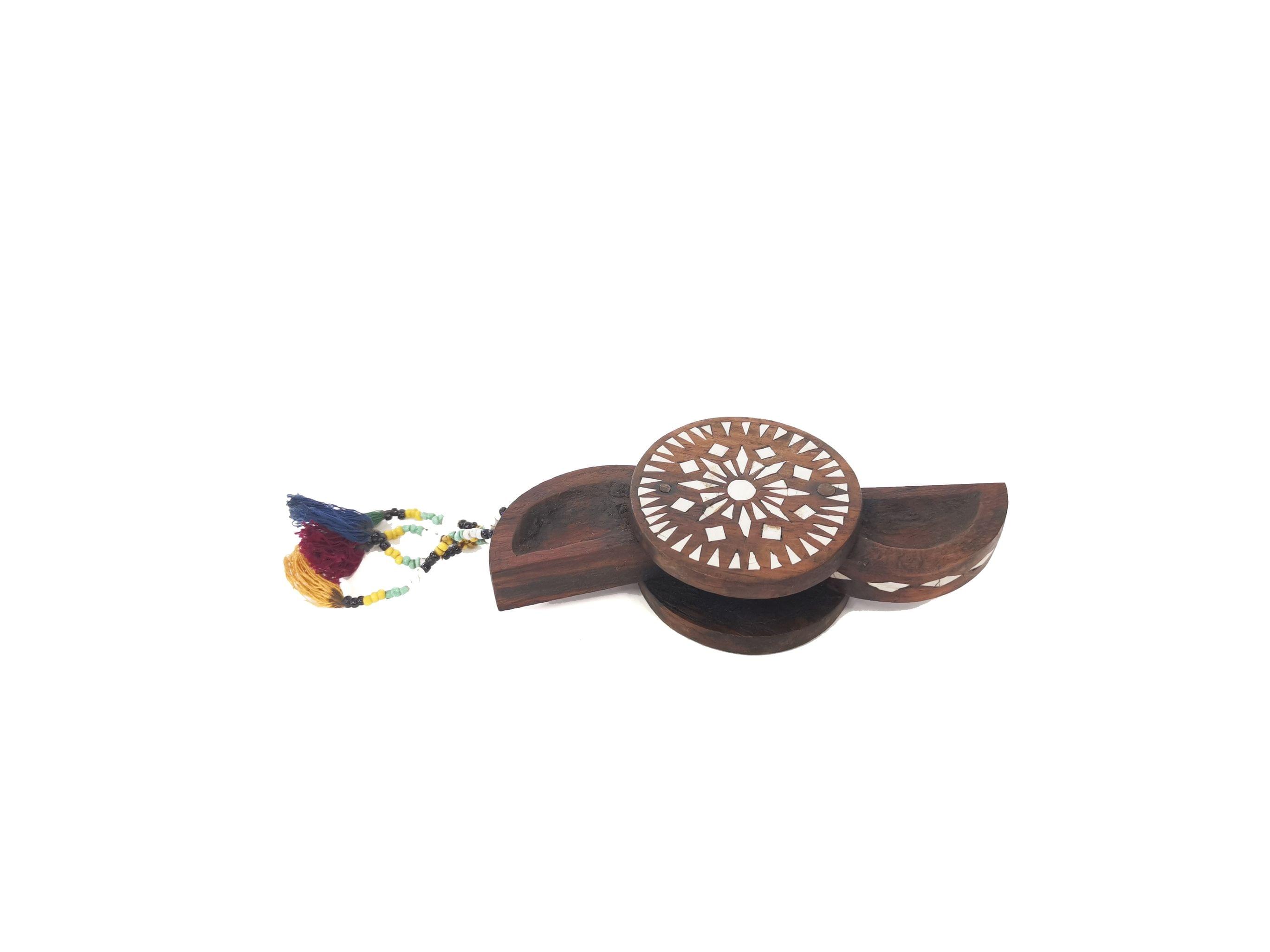 A deux compartiments latéraux, bois et incrustations de nacre, D 6 cm