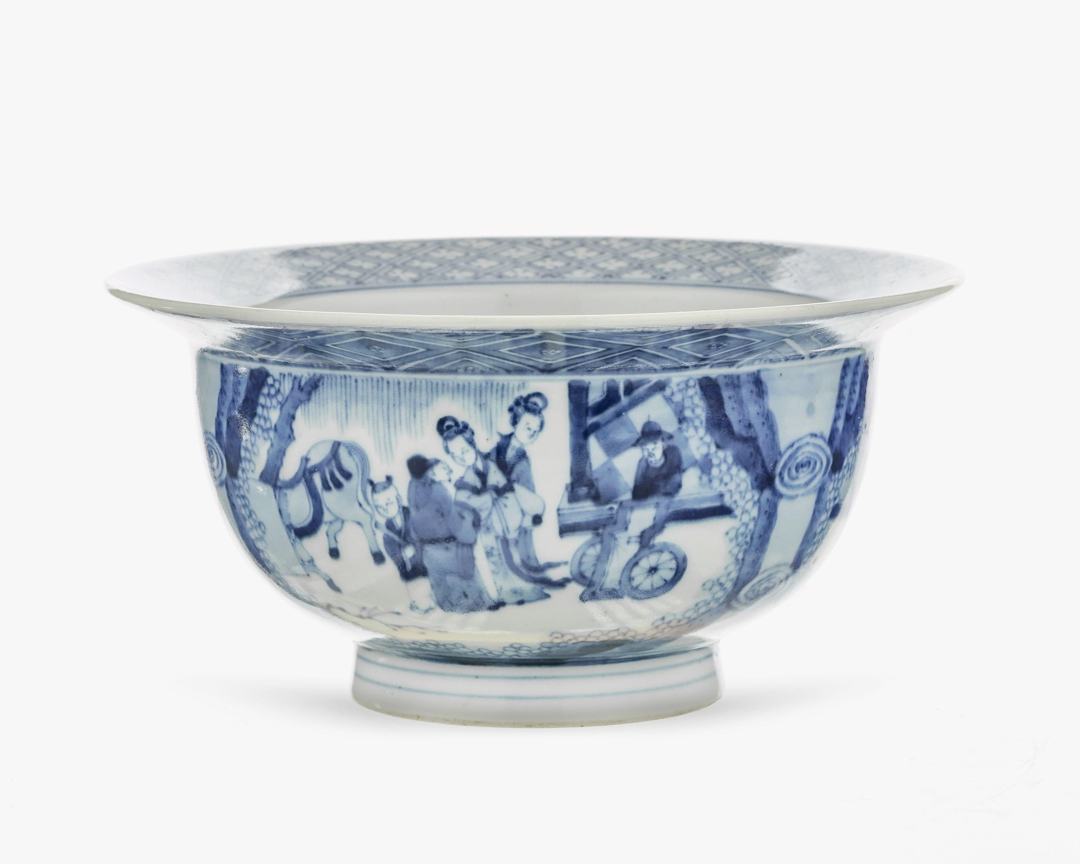 Porcelaine bleu blanc à décor de scènes animées dans trois réserves, D 20 cm