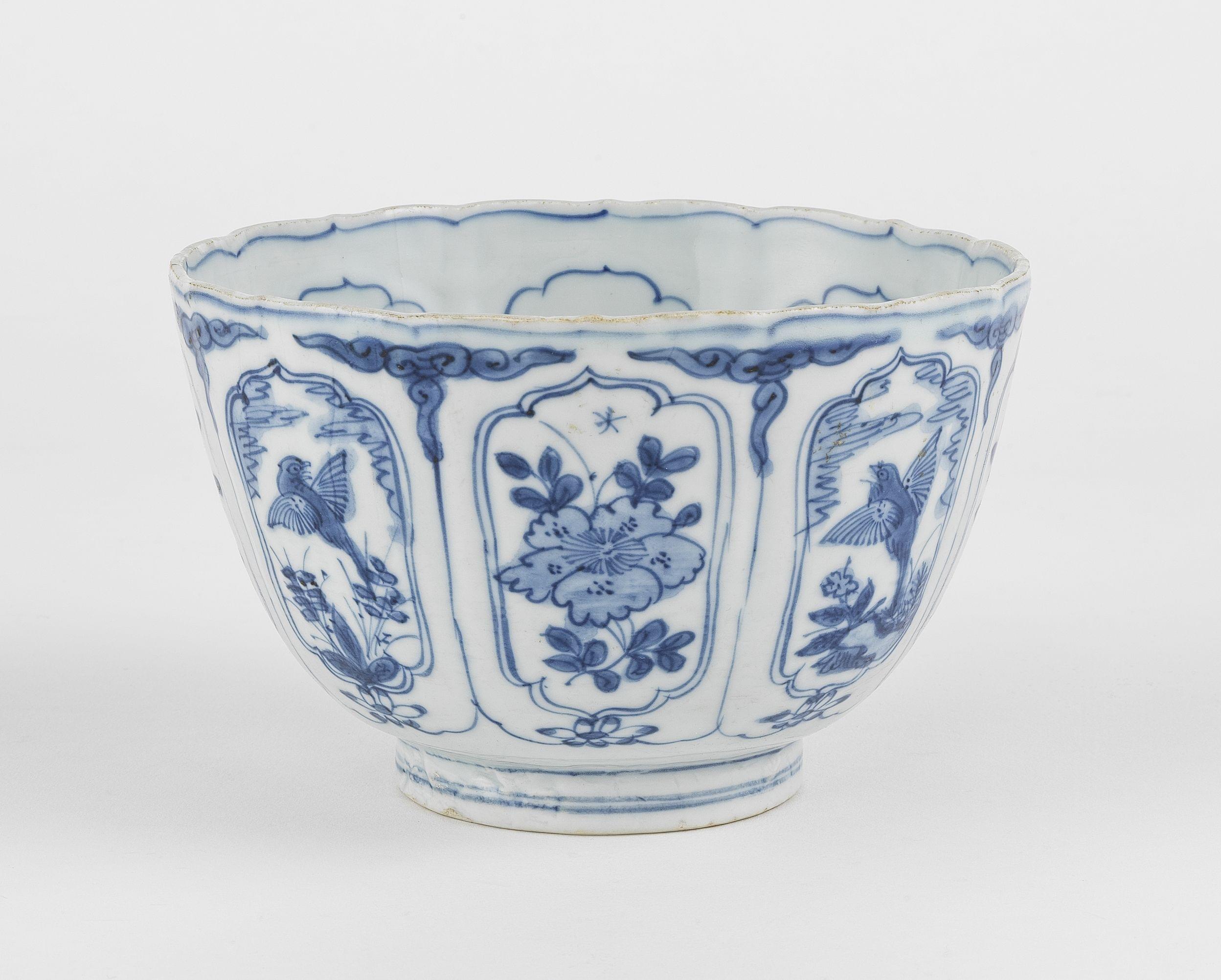 Porcelaine émaillée bleu blanc à décor de fleurs et oiseaux en réserve, D 14 cm. Provenance: Axel Vervoordt, château 's - Gravenzel