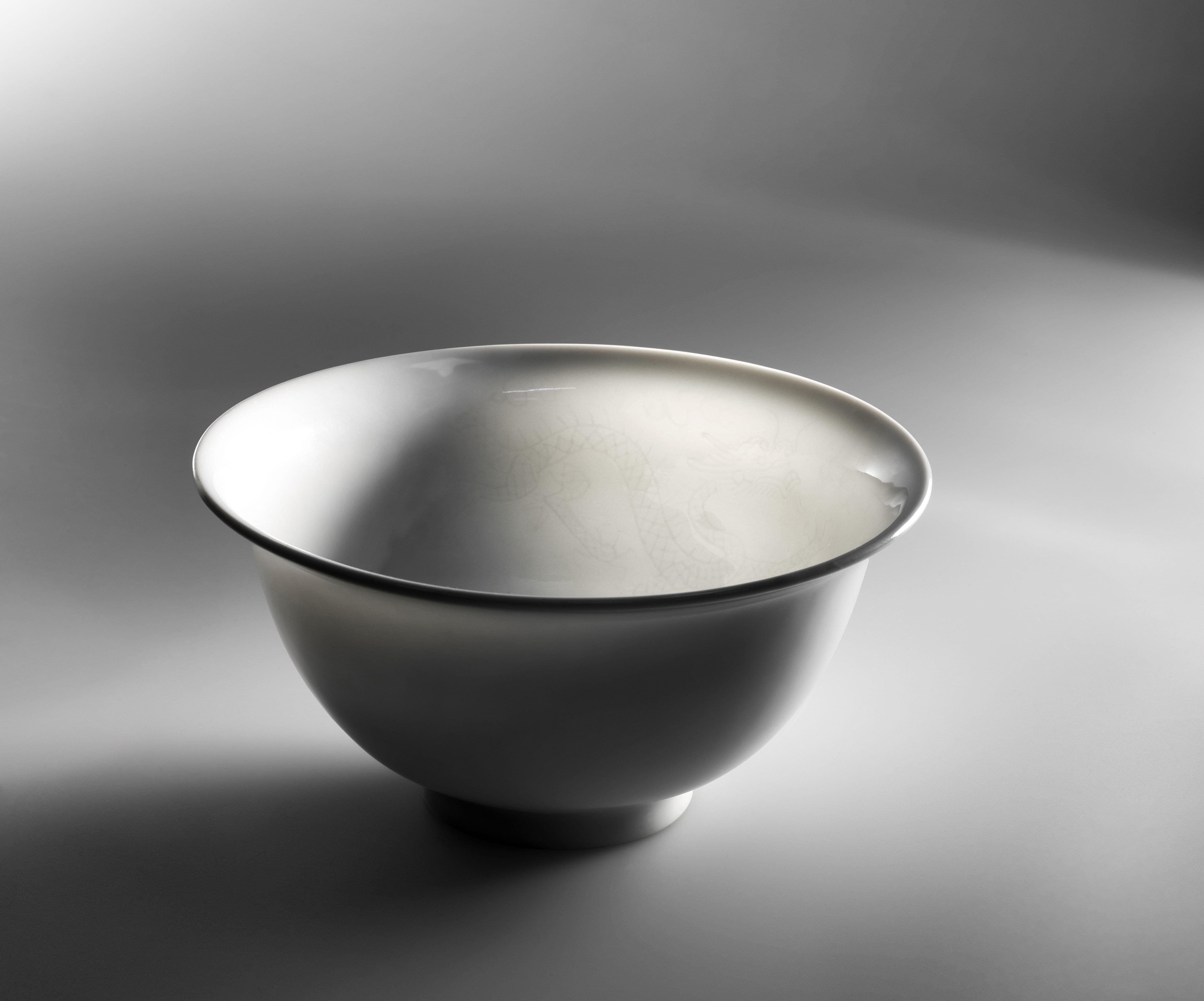 Porcelaine blanche à motif incisé de dragons poursuivant la perle sacrée, D 11,5 cm. An anhua-decorated tianbai dragon tea bowl. Provenance: Collection Prince et Princesse de Savoie. Provenienza: Collezione Principe e Principessa di Savoia