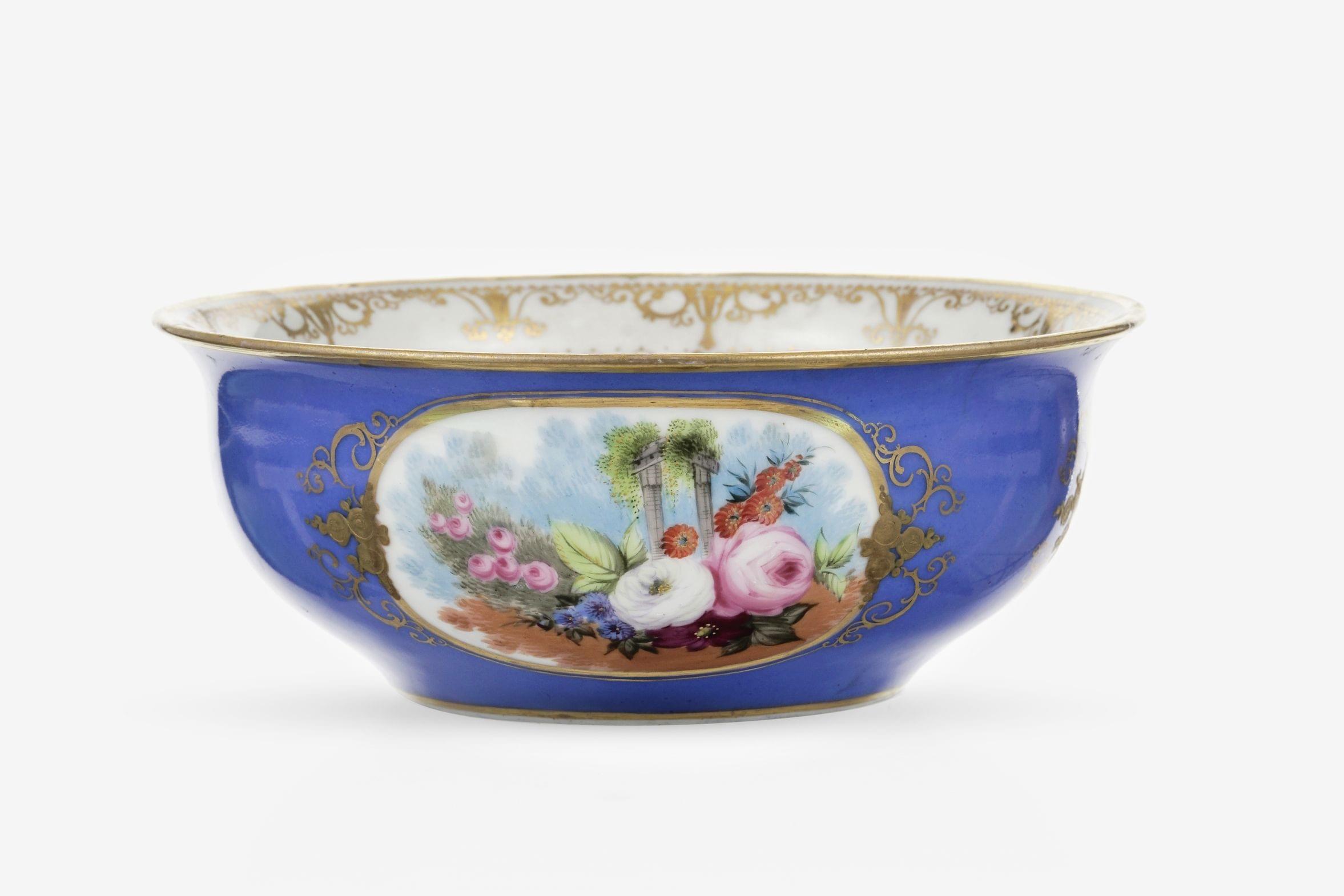 586. Bol bleu ciel à décor de fleurs et ruines antiques dans des médaillons en réserve