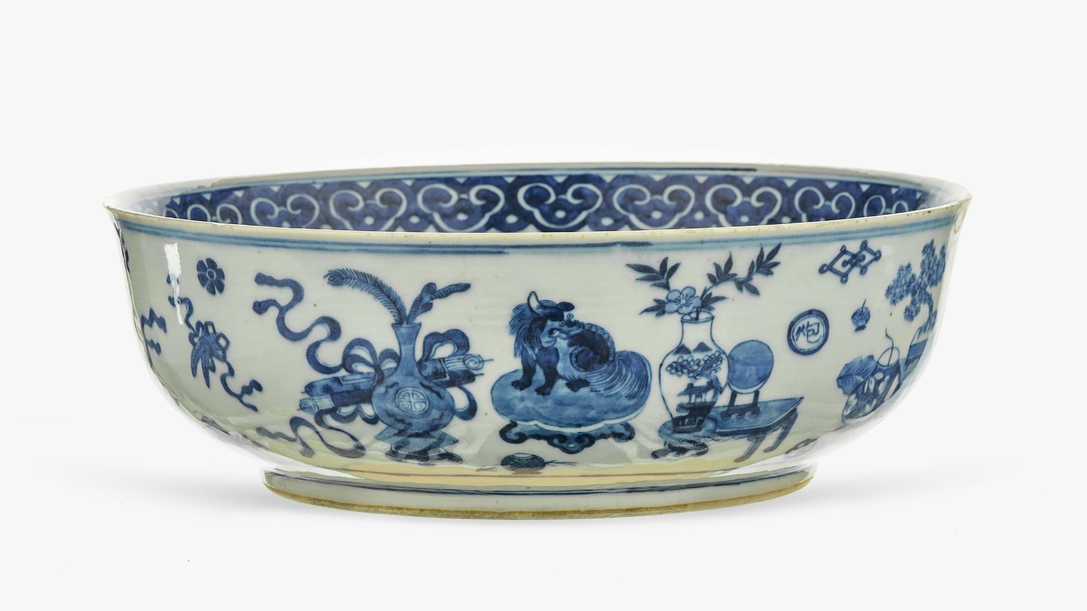 Porcelaine bleu blanc à décor de vases et objets, D 29 cm
