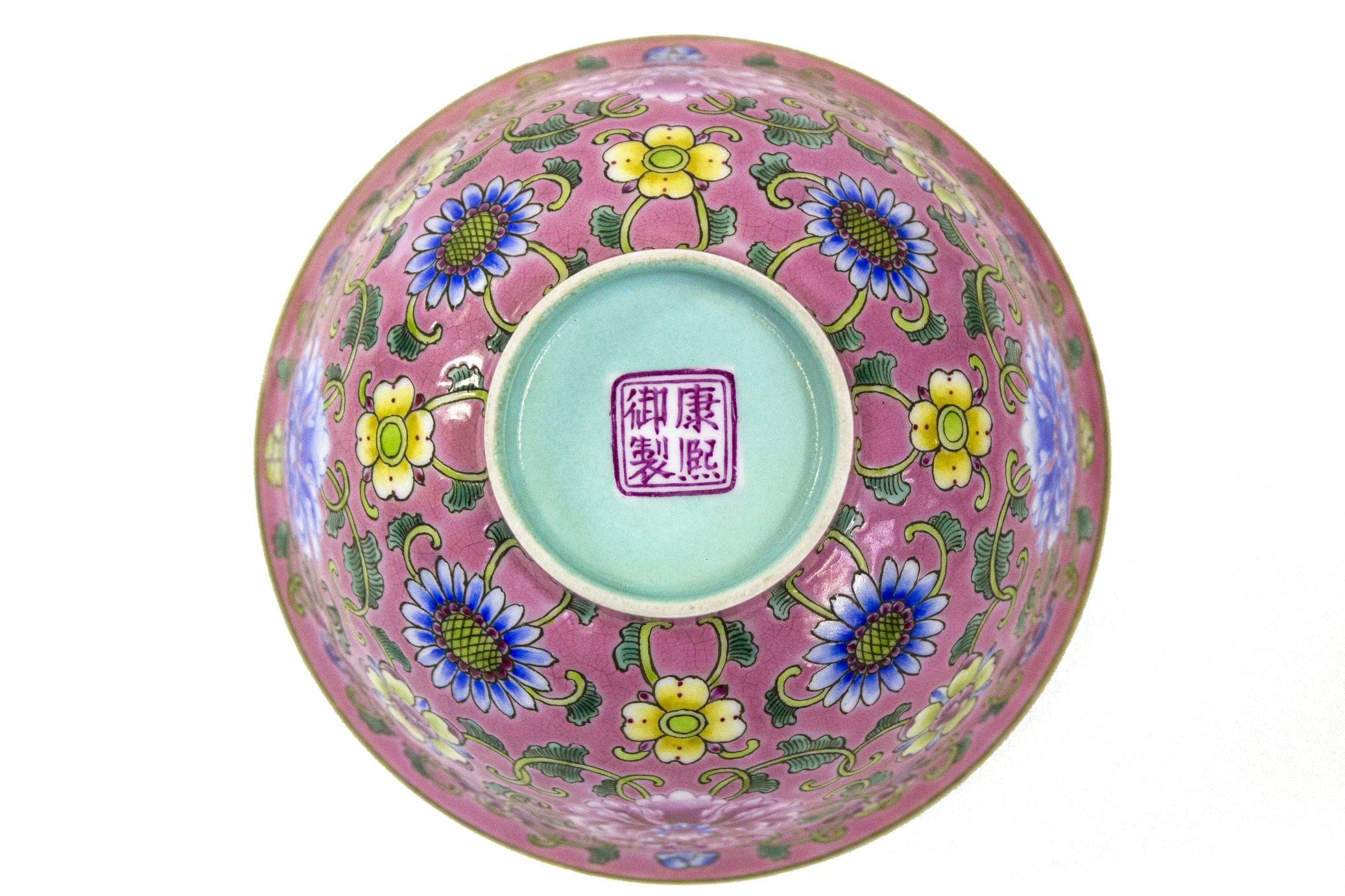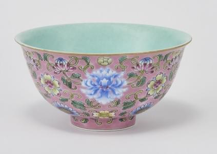 Porcelaine émaillée polychrome à décor de fleurs sur fond rose