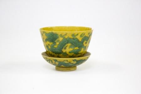 Porcelaine à décor émaillé de dragons verts sur fond jaune, D 10 cm