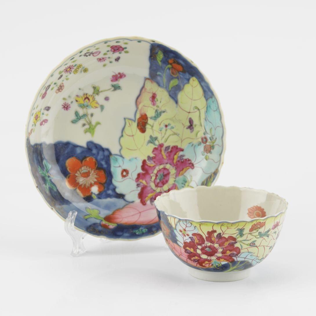 174. Tasse et sous-tasse à décor en camaïeu gris sur fond rose et or