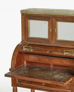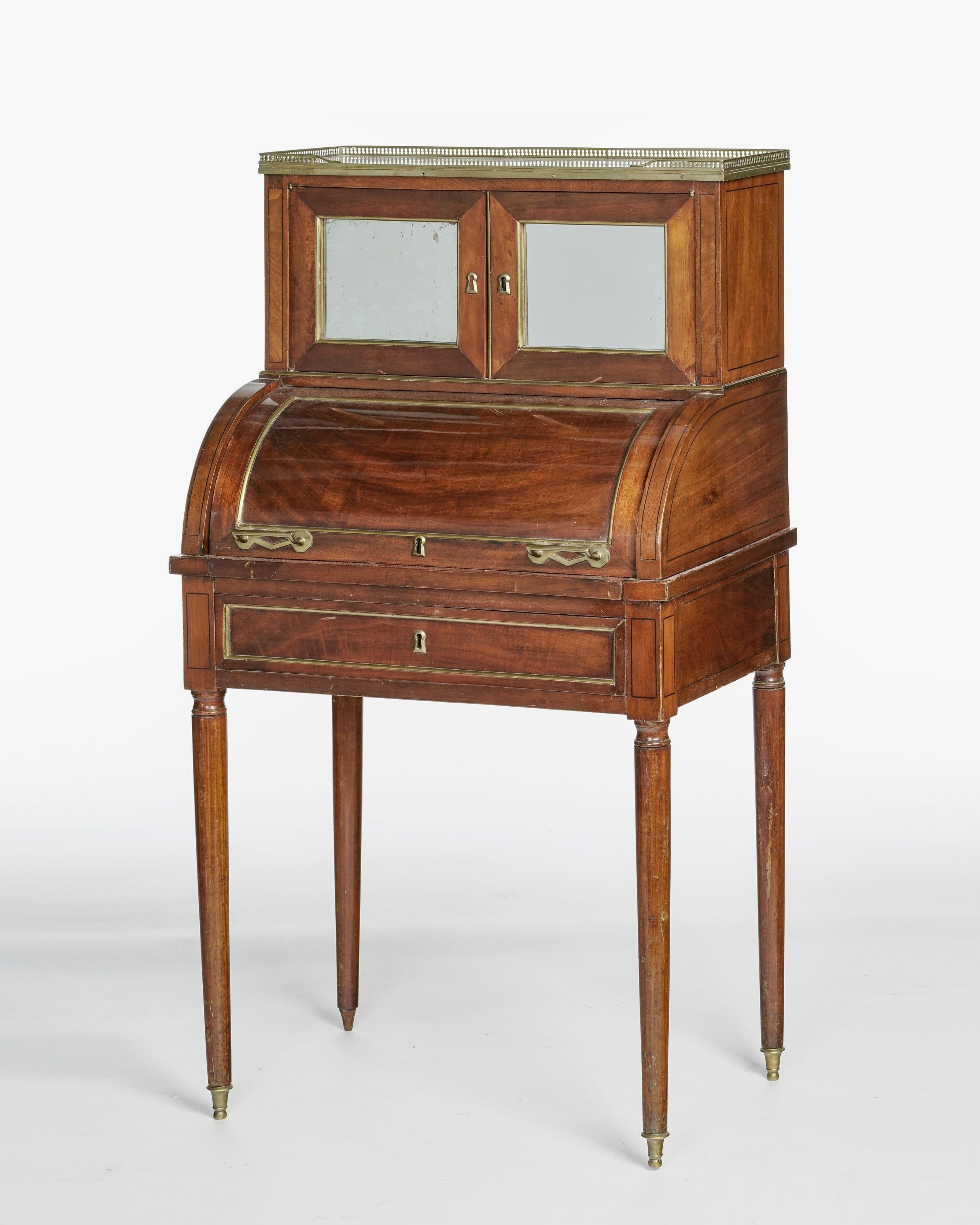 Deux vantaux garnis de miroirs, cylindre ouvrant sur une tablette et deux tiroirs, 1 tiroir, acajou et filets de laiton, marbre blanc à galerie, 120x63x41 cm