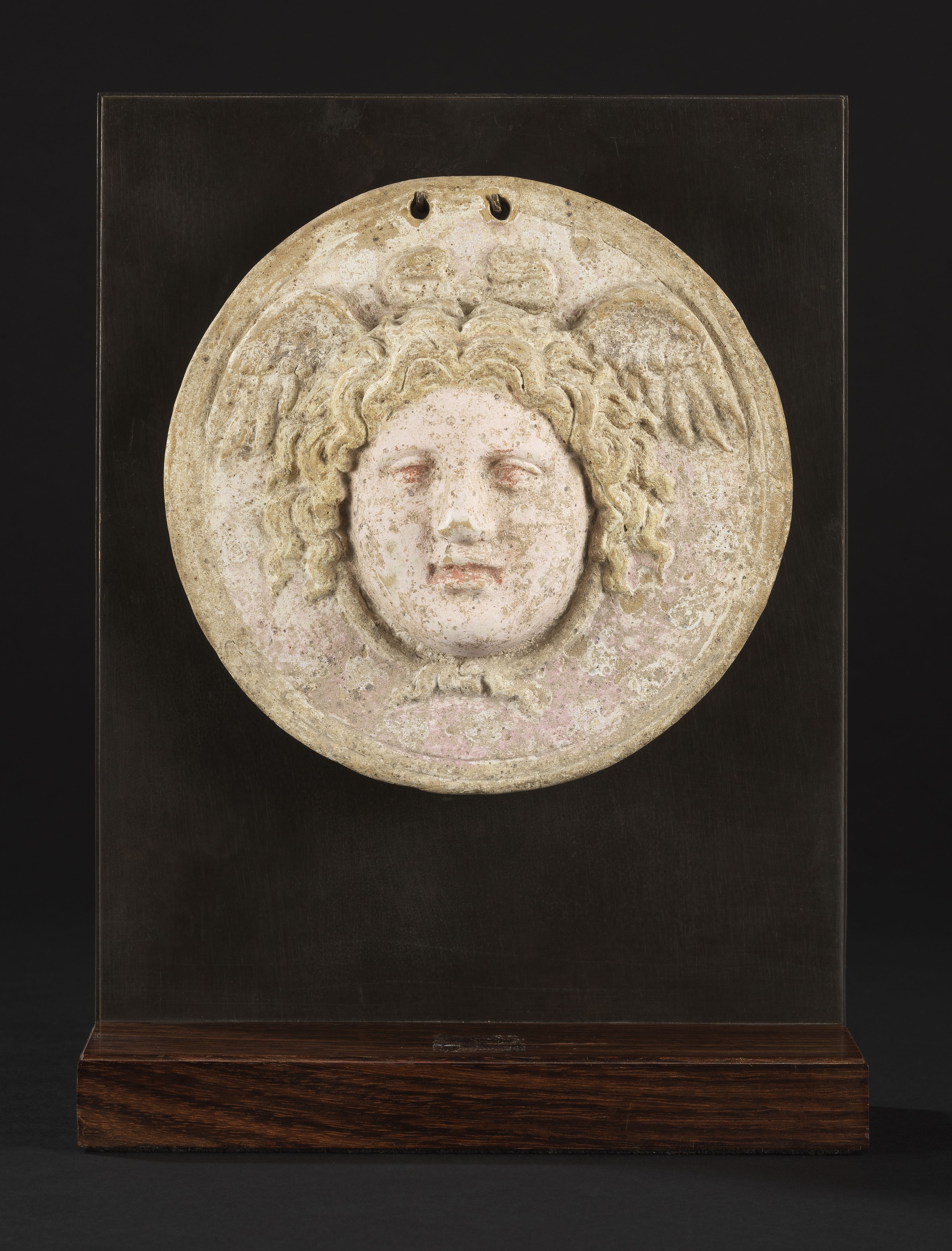 Terre cuite et rehauts de polychromie, D 13 cm; collection d’un...