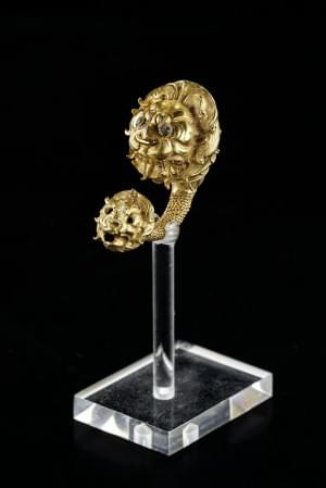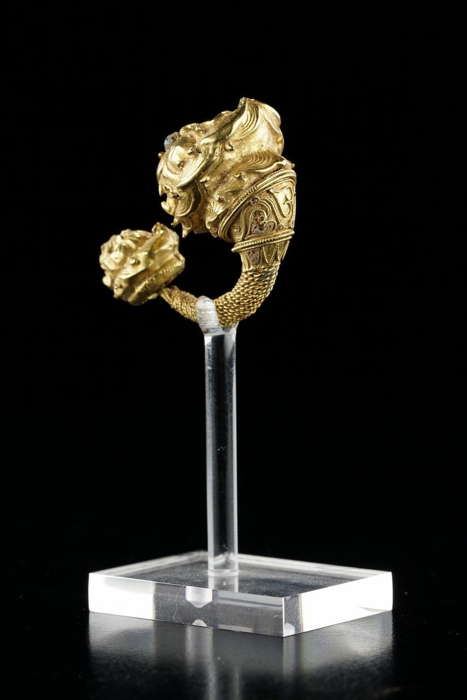 An hellinistic lion headed gold earring. Provenance: Swiss private collection
