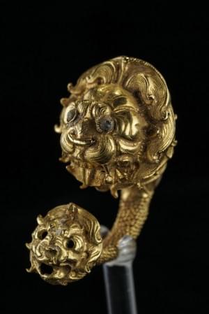 Ornée entre les deux têtes de motifs en relief, de filigrane et granulation, H 3 cm. Provenance: Collection privée suisse