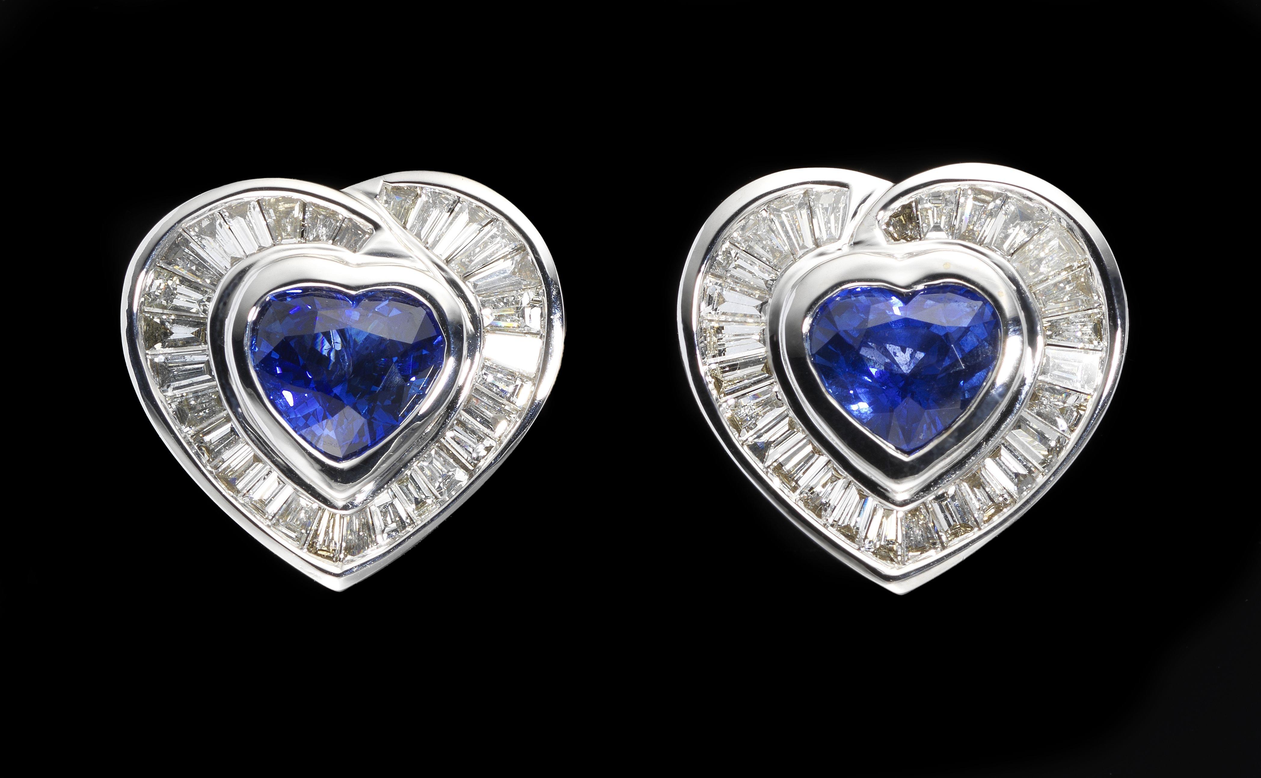 172. Boucles d'oreilles à motif de cœurs centrés de saphirs taille cœur (total env. 4,5 ct) et entourés de diamants taille baguette (total env.