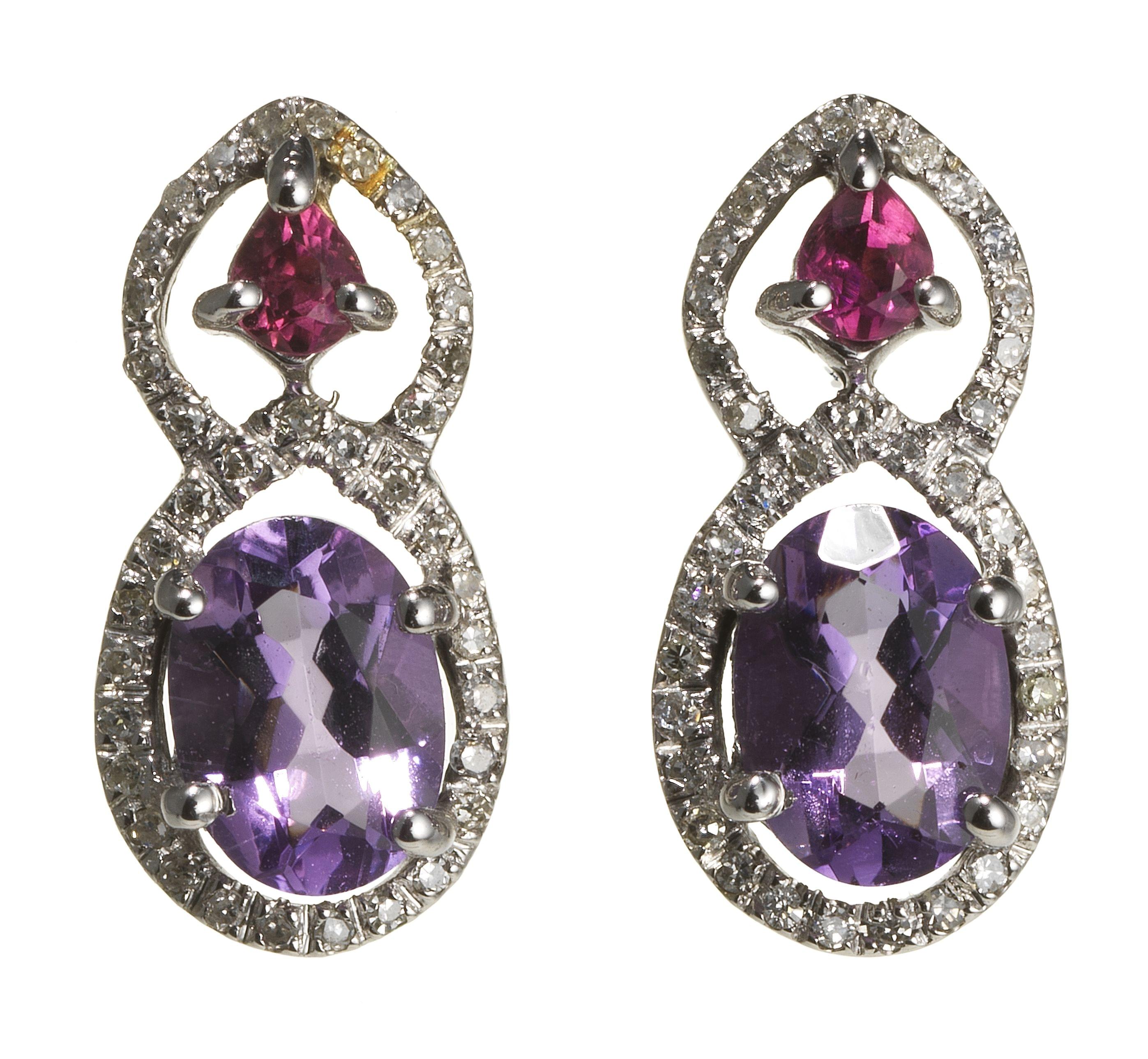 3240. *Boucles d'oreilles ajourées serties d'une améthyste taille ovale Rehaussée d'une tourmaline rose taille poire et de diamants, or gris 375,