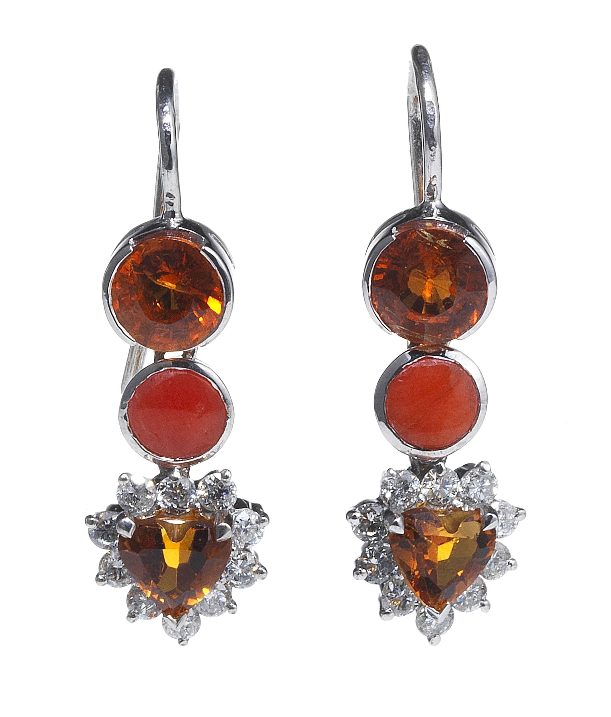Terminées par un coeur en citrine (env. 0,7 ct) entouré de diamants et surmonté d'un corail taille cabochon (env. 0,4 ct) et d'une spessartite taille brillant (env. 1,5 ct), or gris 750, H 2,5 cm, 3 g. Pour les lots précédés d'un *, la TVA de 7,7% est due sur l'entier du prix d'adjudication.