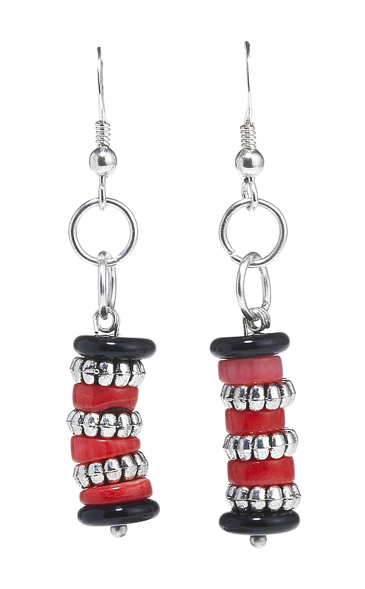 3021. *Boucles d'oreilles retenant des disques de corail et d'onyx alternés de motifs d'oves