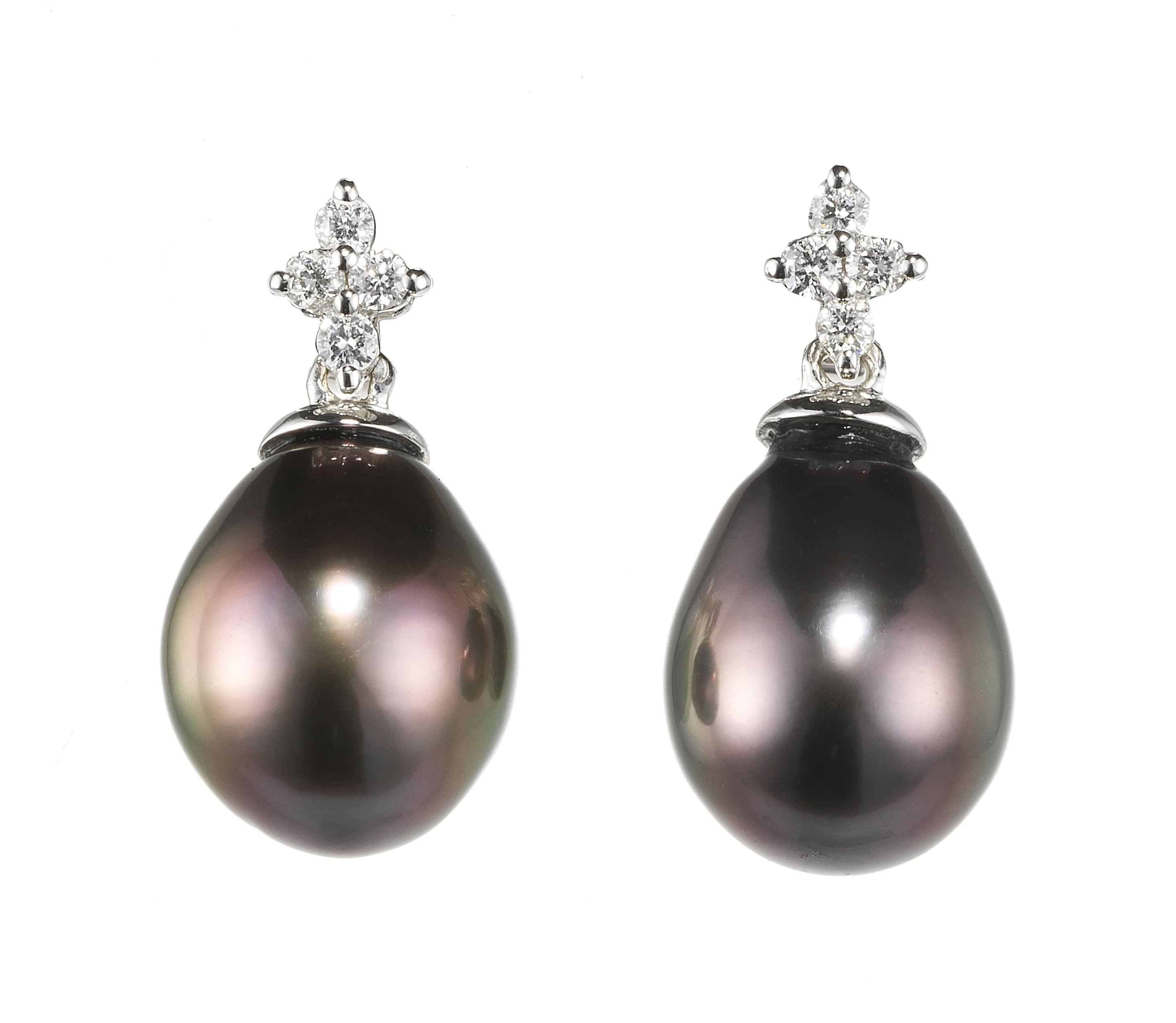 3349. Boucles d'oreilles retenant des perles de Tahiti en goutte (D env. 8,5 mm) rehaussées de petits diamants