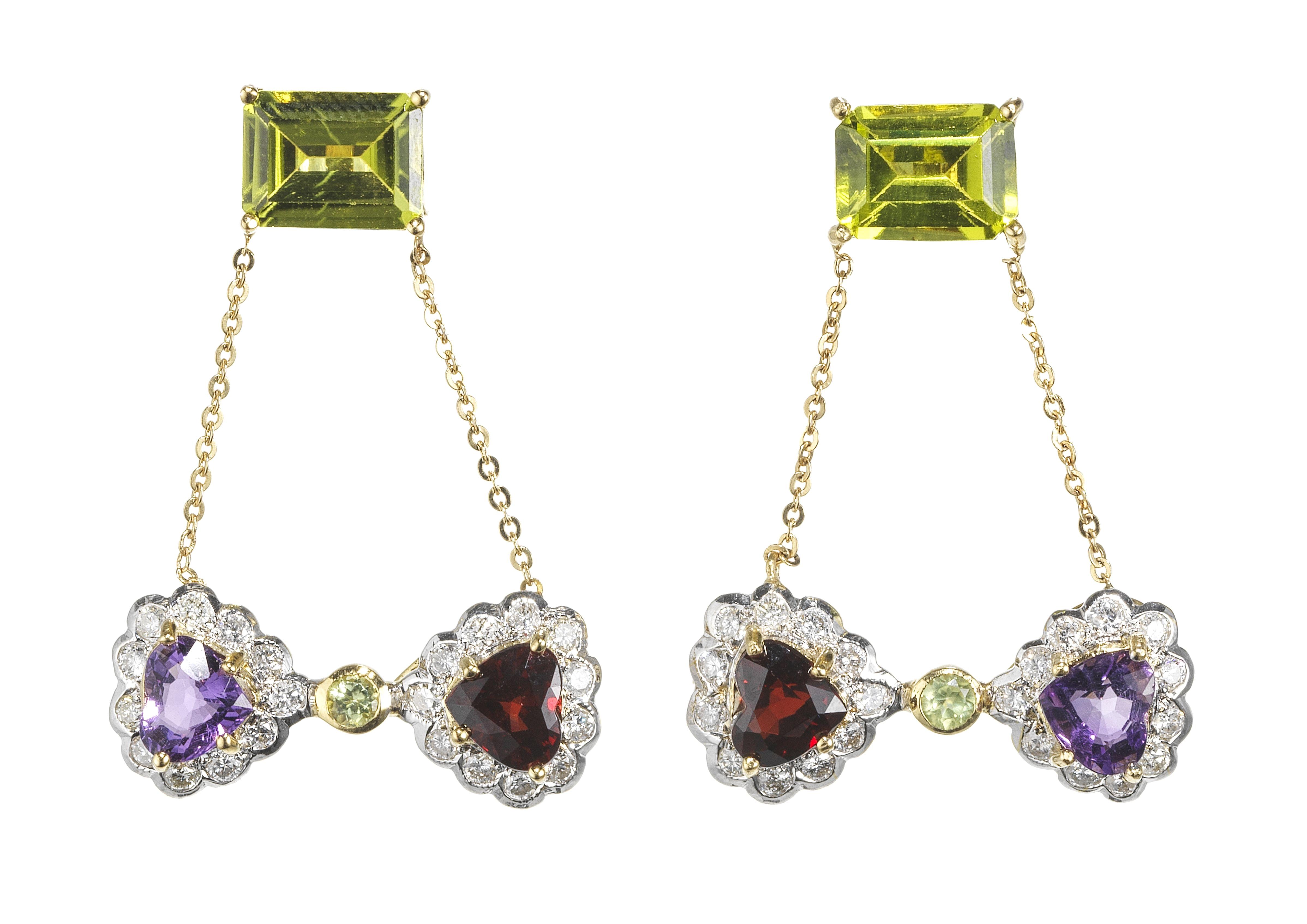 Retenant un nœud papillon serti d'une améthyste et d'un grenat taille poire entourés de diamants, or 750, H 3 cm, 8 g. Pour les lots précédés d'un *, la TVA de 7,7% est due sur l'entier du prix d'adjudication.