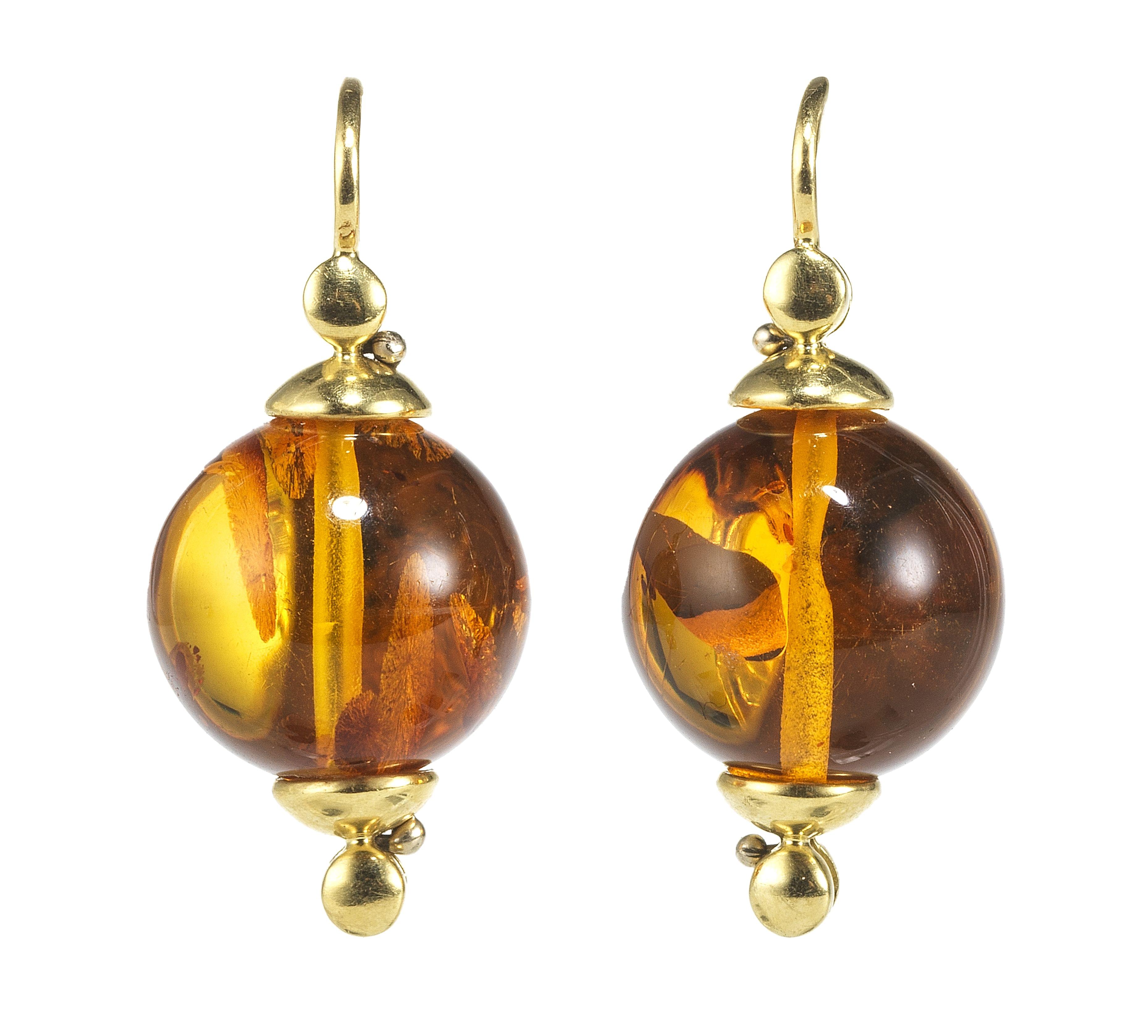 3192. *Boucles d'oreilles serties de boules d'ambre (D env. 14 mm)