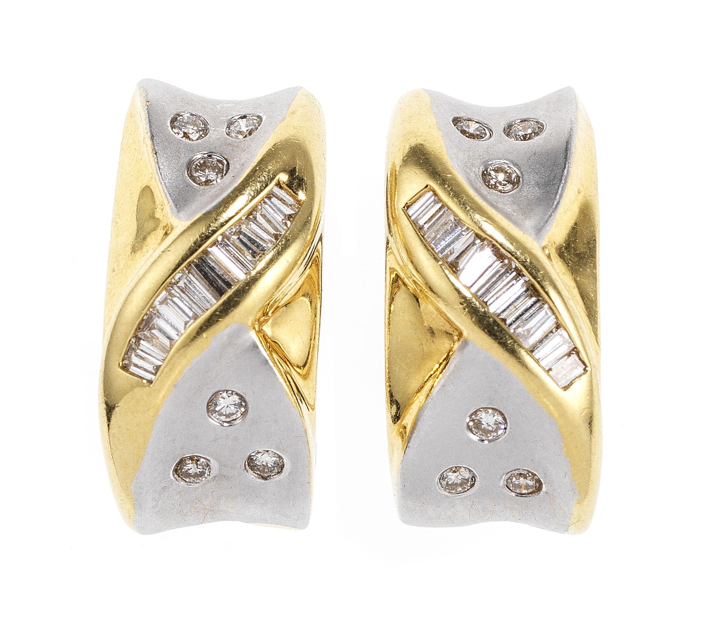 3395. *Boucles d'oreilles stylisées bicolores serties de diamants taille brillant et taille baguette