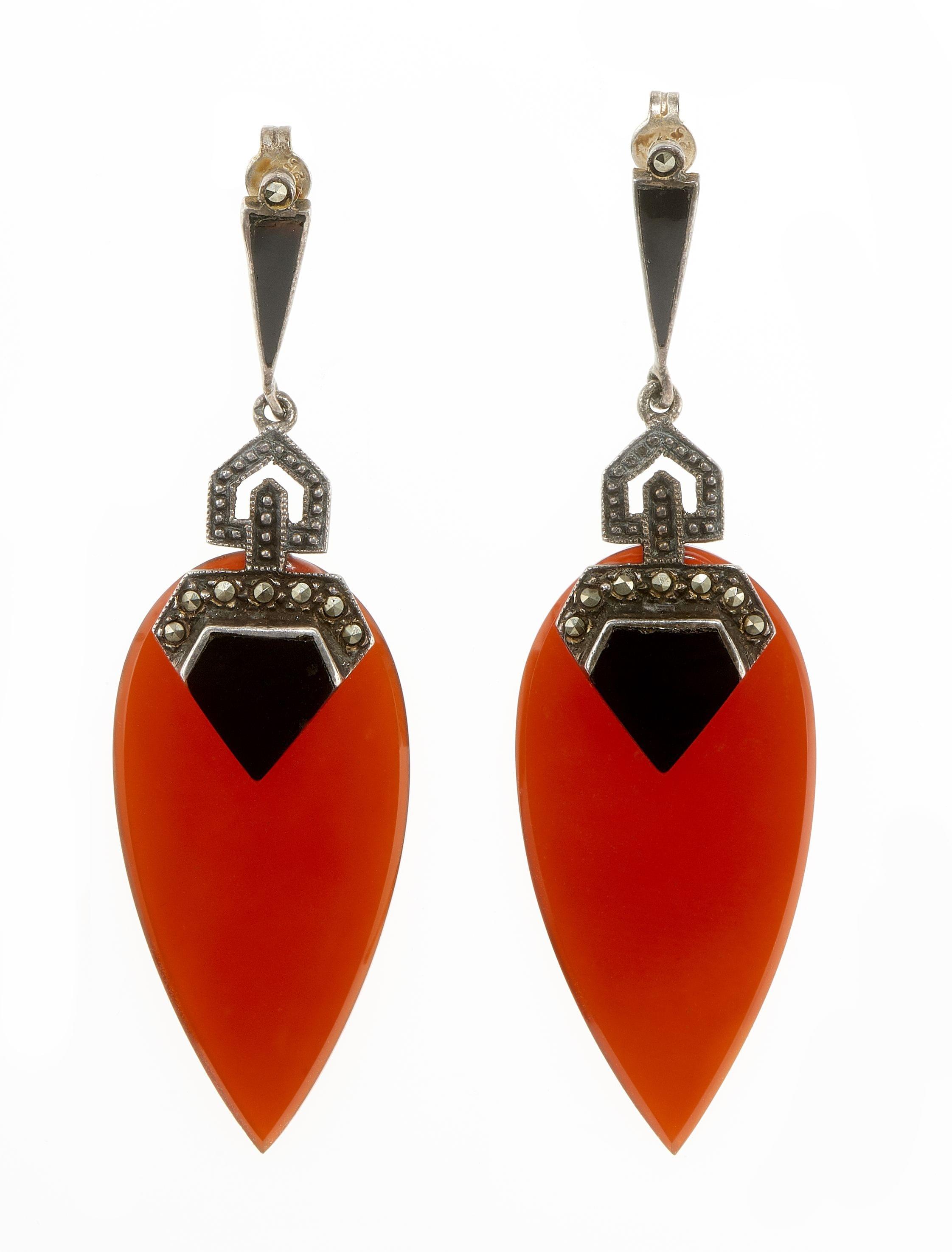 4170. Boucles d'oreilles Art déco composées de cornaline et d'onyx rehaussées de marcassites et d'émail noir