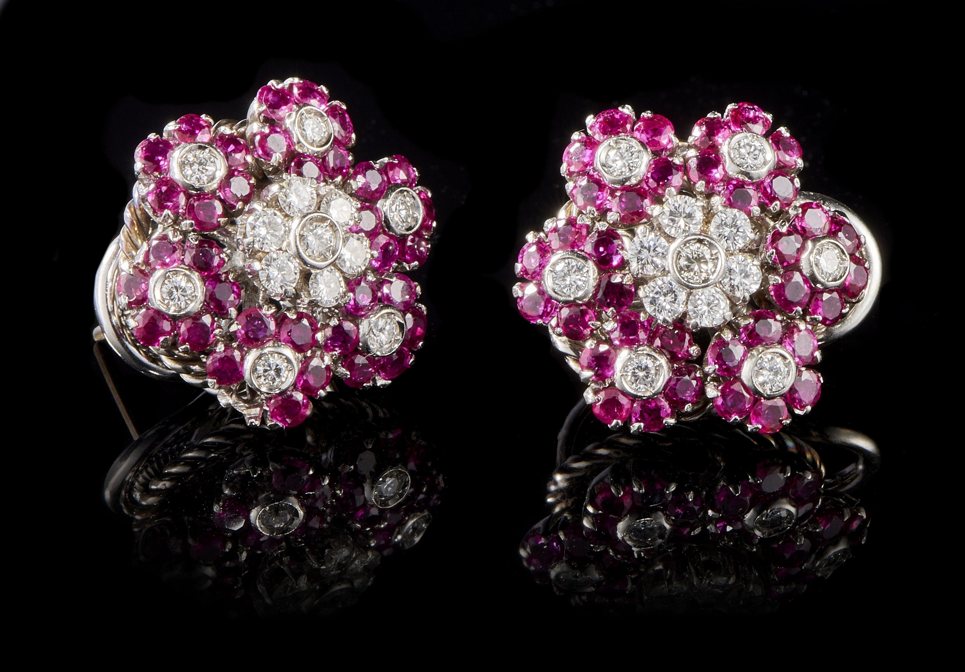 126. Boucles d'oreilles fleurs serties de rubis et de diamants