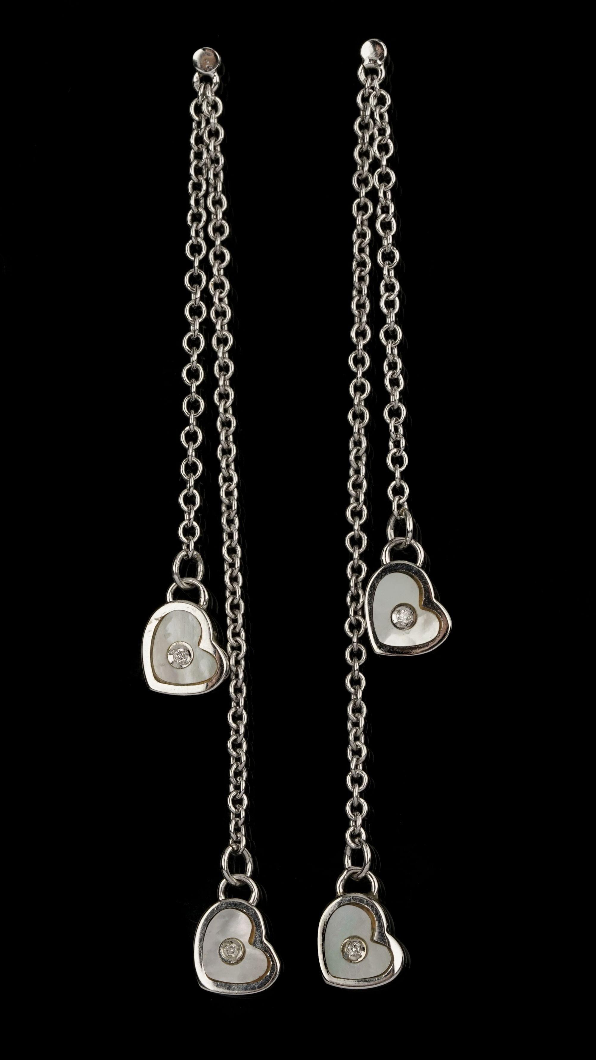 774. Boucles d'oreilles longues retenant des cœurs de nacre sertis de diamants