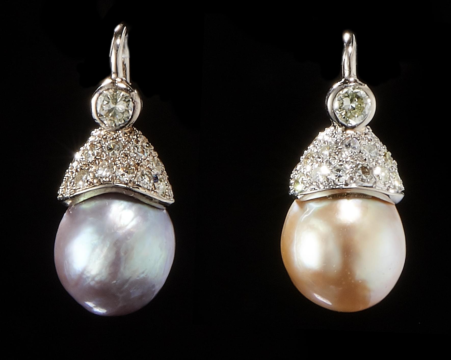 1005. Boucles d'oreilles retenant chacune une perle fine en goutte, l'une grise et l'autre "light brown" rehaussées de diamants