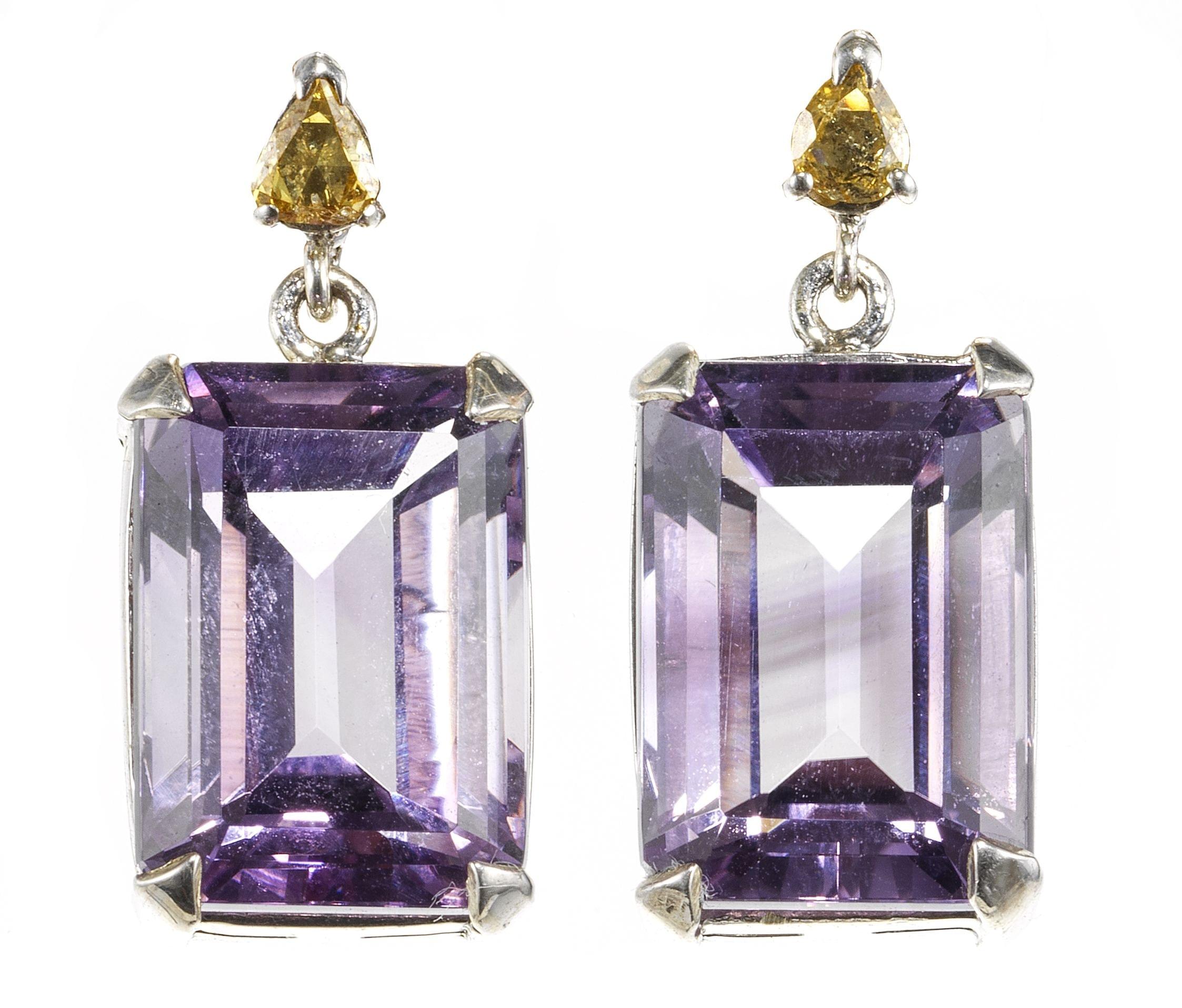 3209. *Boucles d'oreilles retenant une améthyste taille émeraude (env. 13 ct) rehaussée d'un diamant jaune taille poire