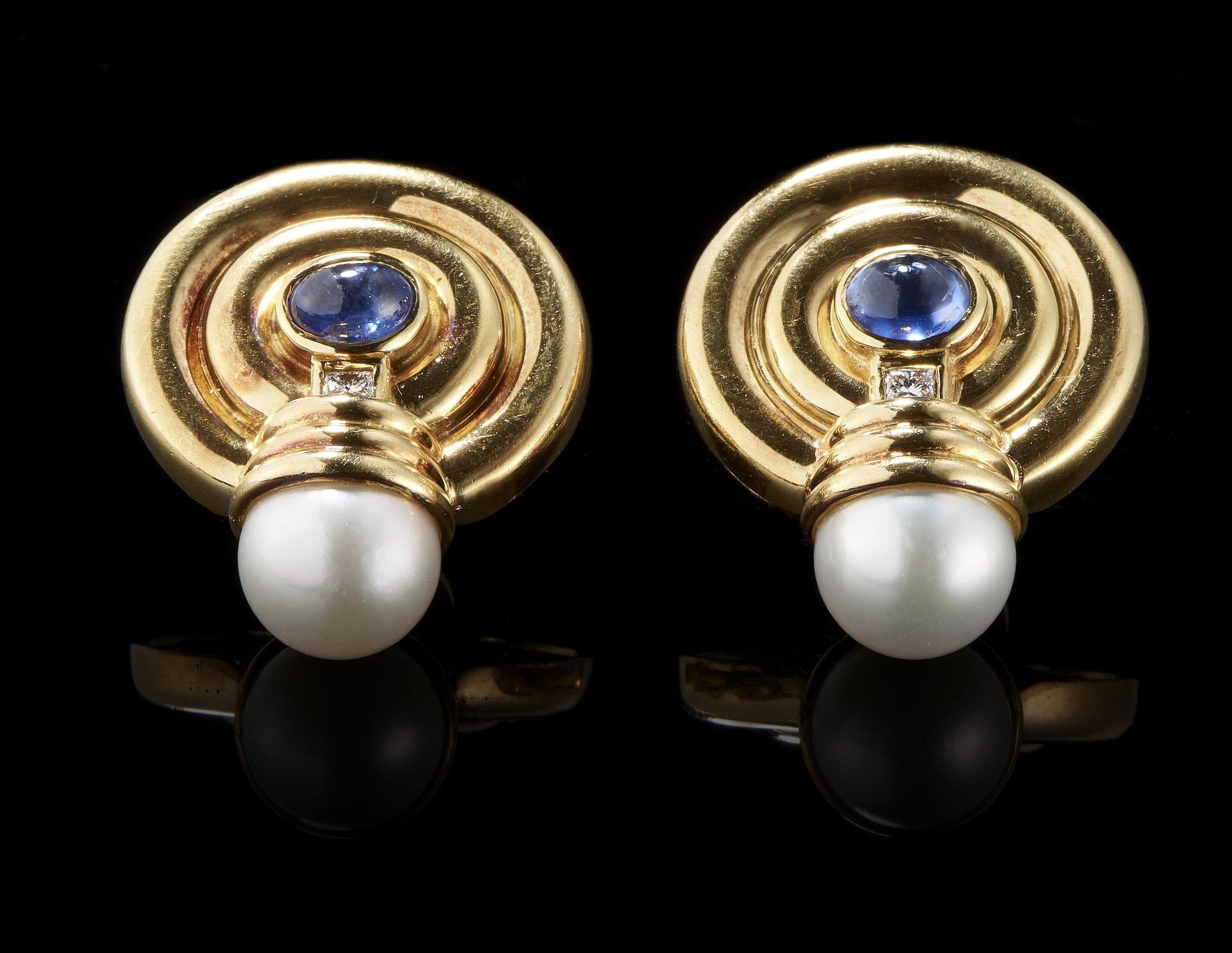 118. Boucles d'oreilles serties chacune d'une perle rehaussée d'un saphir taille cabochon et d'un diamant taille princesse