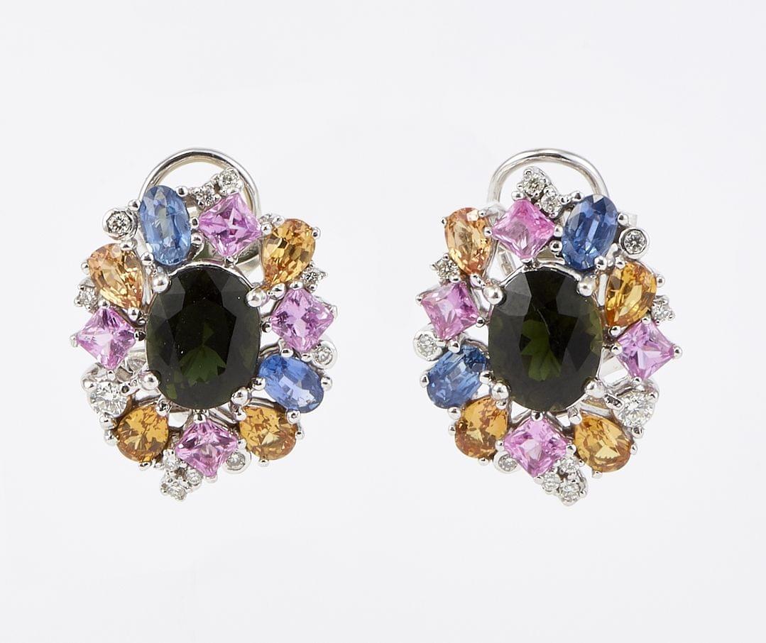 3263. Boucles d'oreilles serties de tourmalines vertes entourées de saphirs de couleurs et rehaussées de diamants