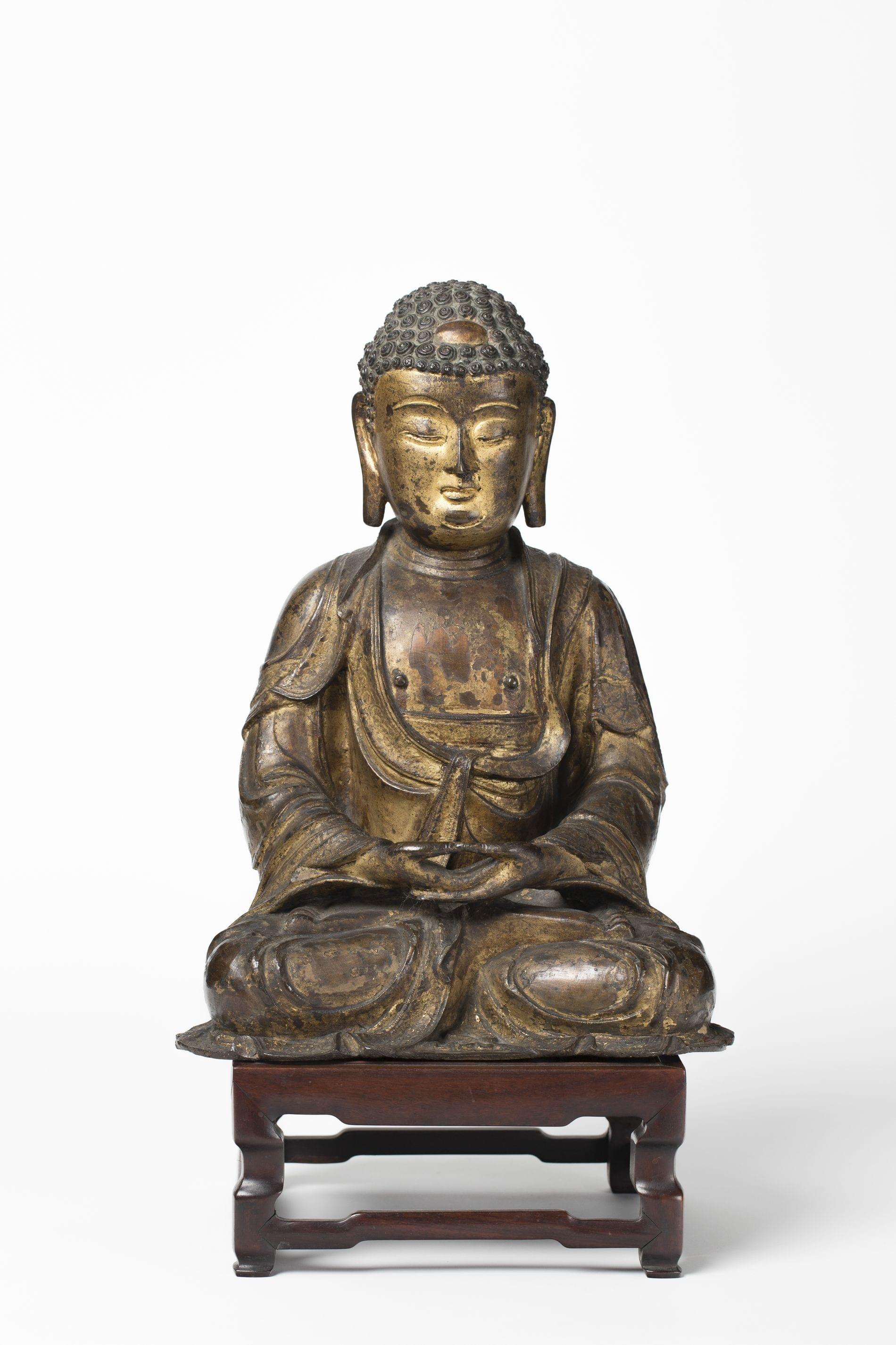 Bronze patiné et anciennement doré, H 38 cm. A gilt-bronze figure of Buddha, Ming dynasty. Provenance: collection of a swiss gentleman