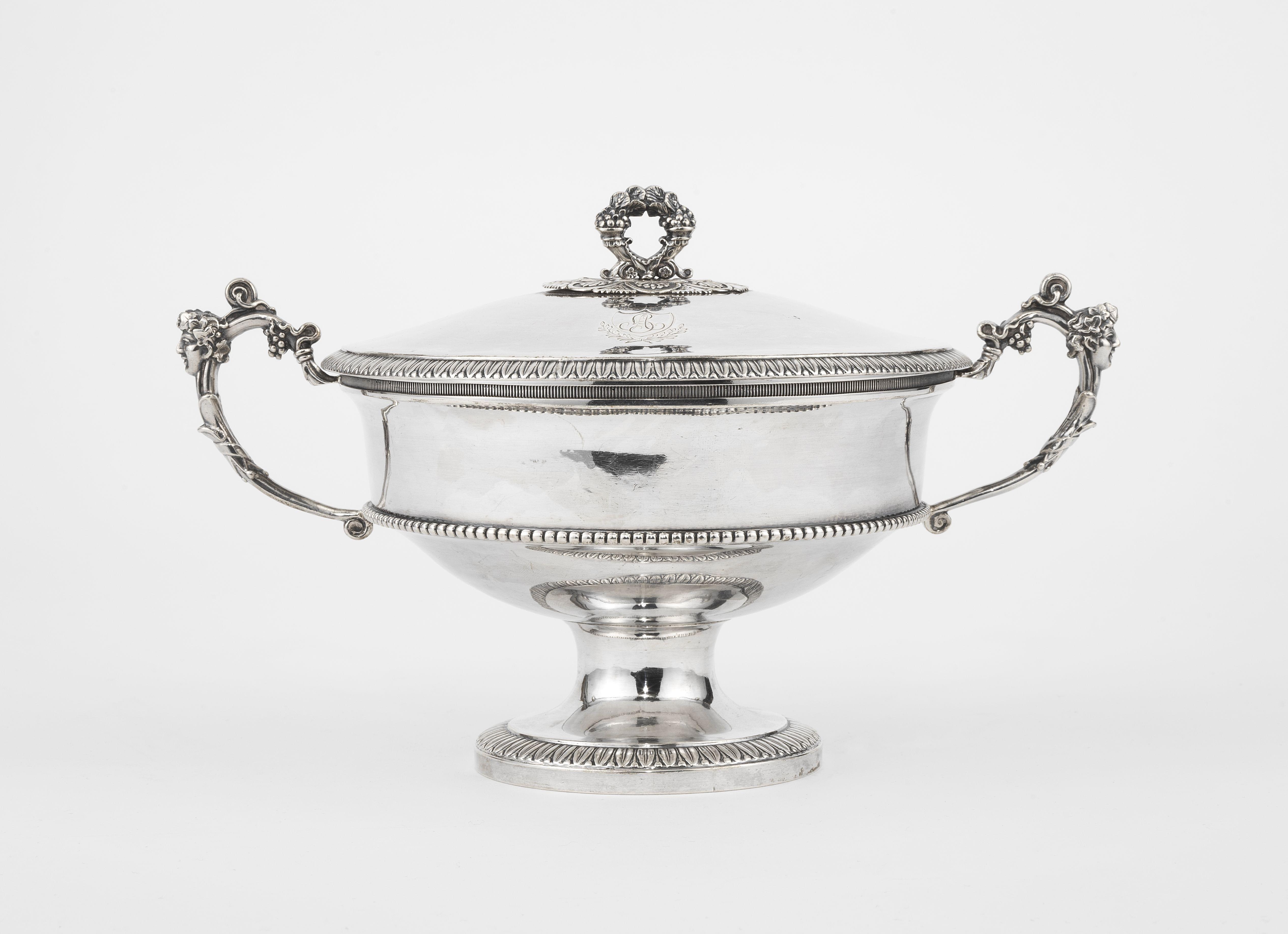 3793. Bouillon néoclassique d'époque Restauration à anses tête de Bacchus