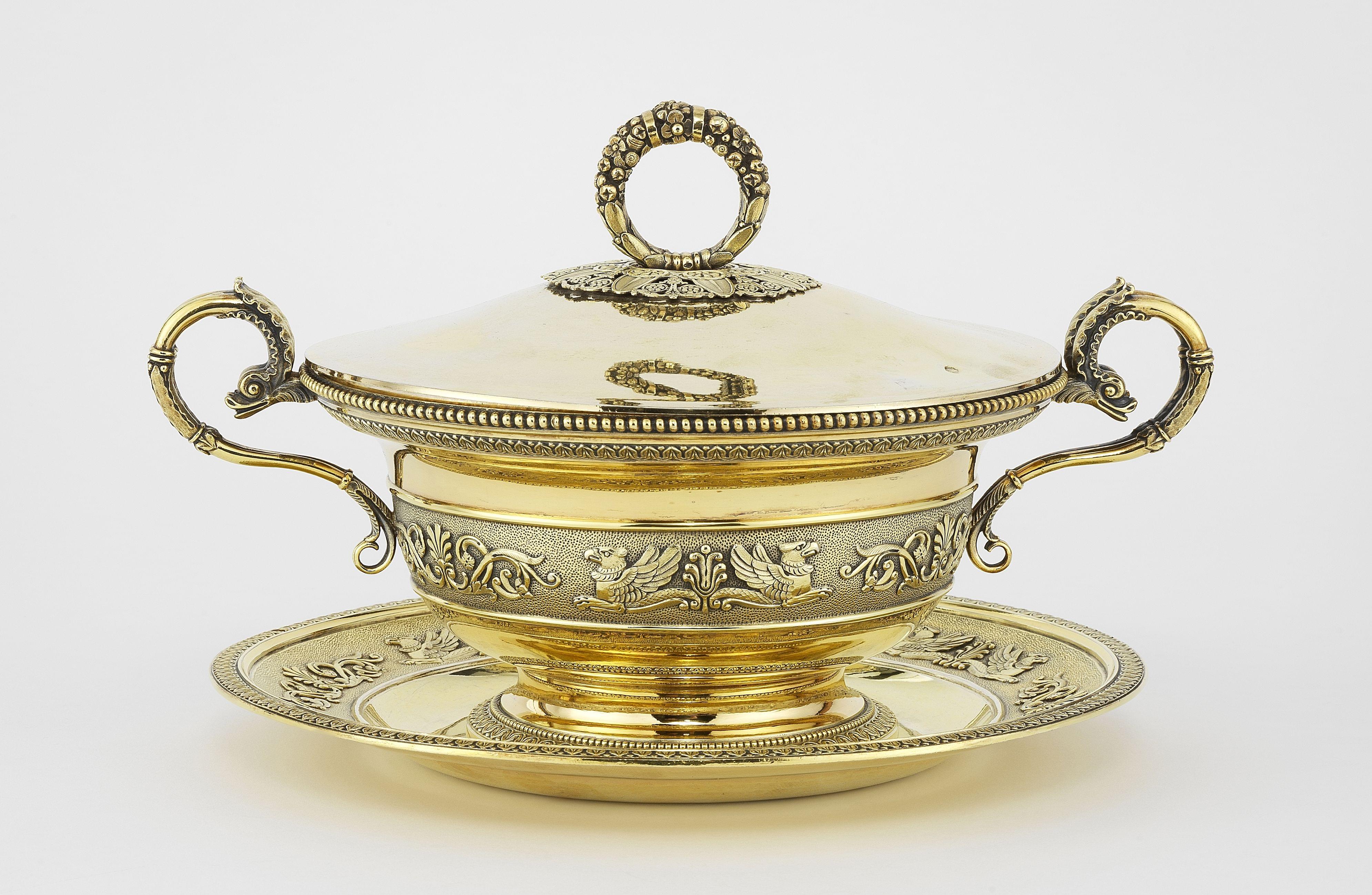 211. Bouillon sur présentoir à décor appliqué de griffons et palmettes d'époque Restauration