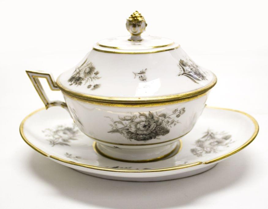 3134. Bouillon sur présentoir à filet doré et décor de bouquets de fleurs en grisaille