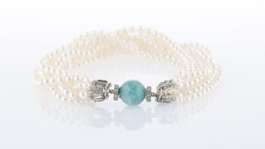 56. Bracelet de perles multi-rangs, fermoir serti d'une boule d'amaz...