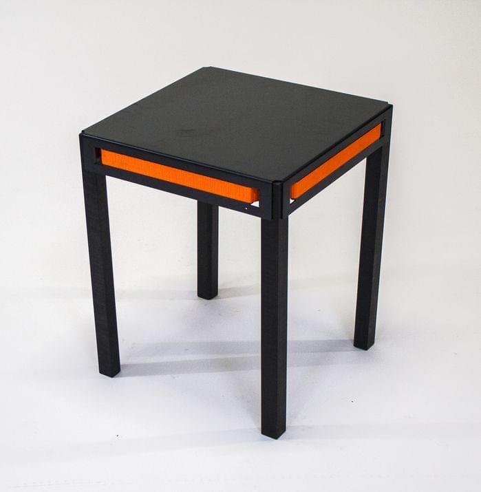 Deux tiroirs, un abattant, pieds compas, bois laqué brun, placag...