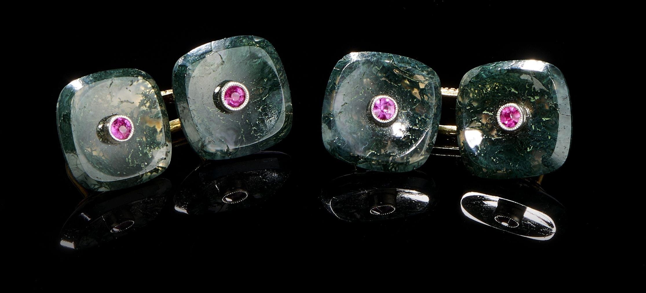 51. Boutons de manchette retenant des motifs en agate mousse sertis de rubis