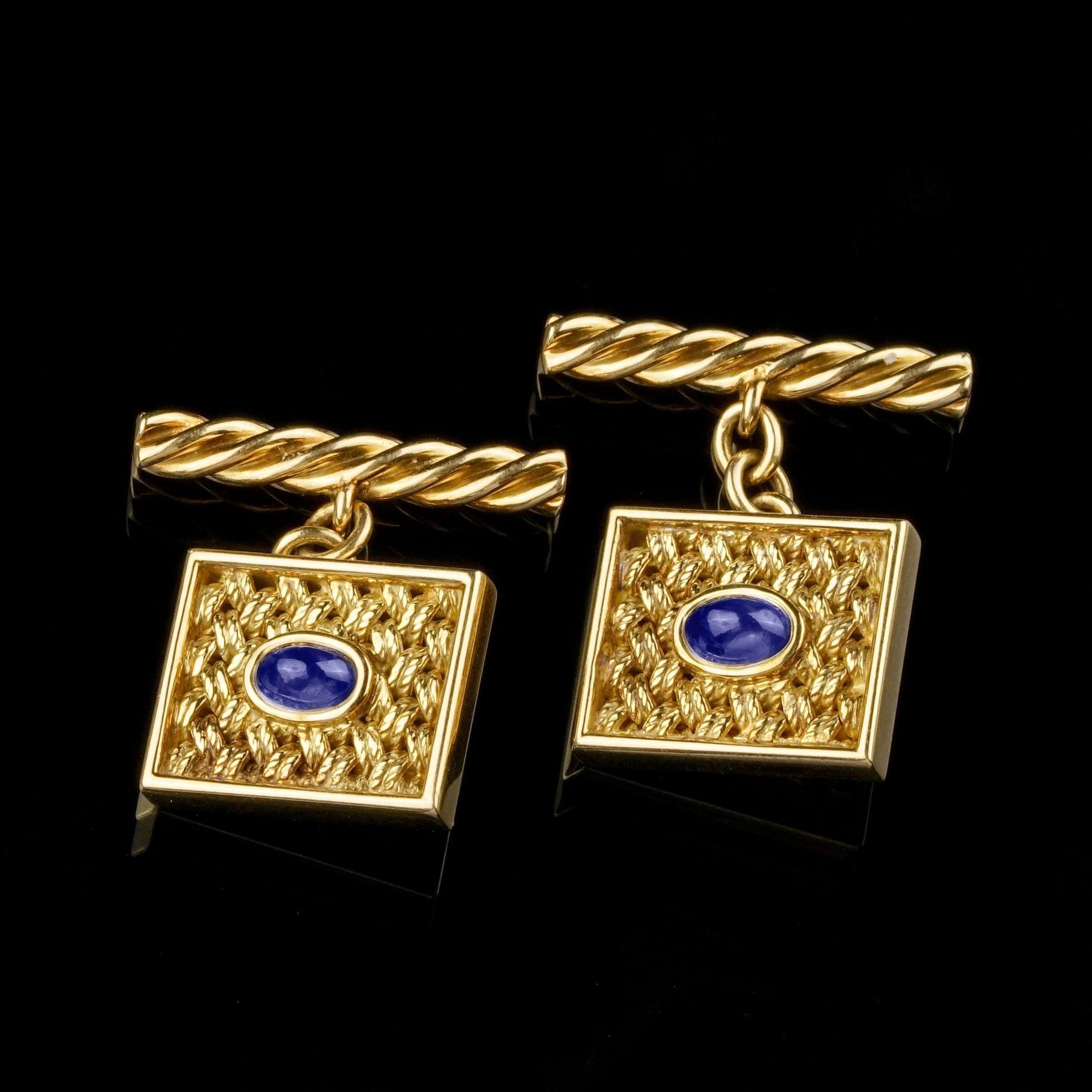 651. Boutons de manchettes à décor de vannerie et sertis de saphirs cabochon
