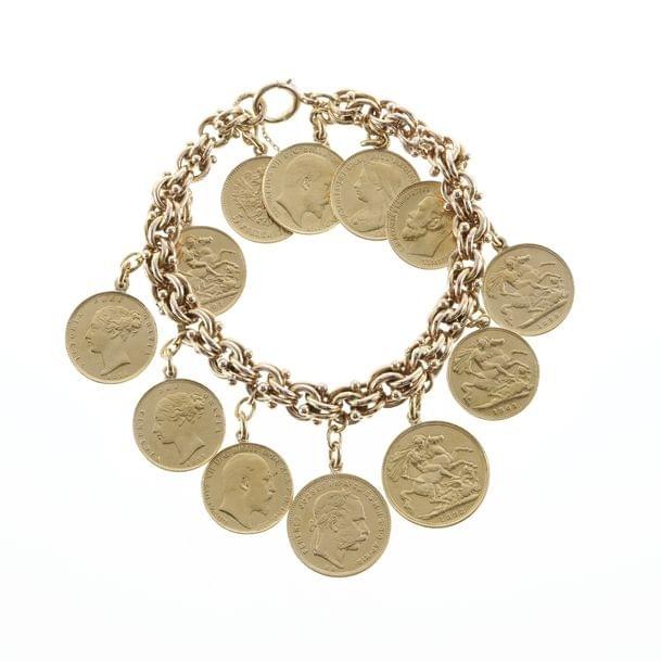 297. Bracelet à maille fantaisie retenant 9 pièces d'or anglaises datées de 1876, 1877, 1893, 1895, 1899, 1903, 1906 et 1907, 2 pièces d'or russes datées de 1898 et une pièce d'or de l'empire d'Autriche-Hongrie datée de 1878