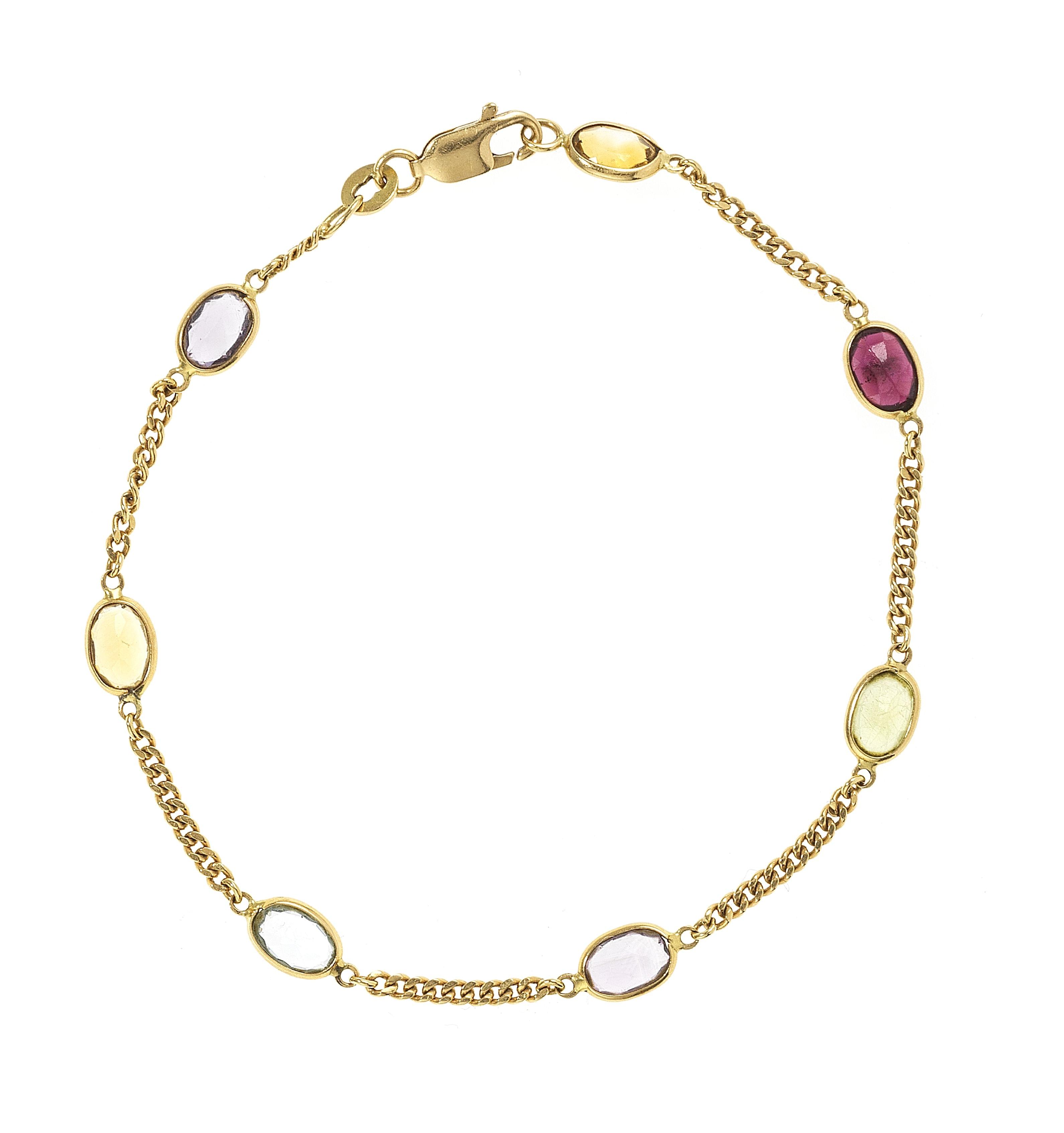 Serti de pierres fines telles que le grenat, l'améthyste, le péridot, la citrine et la topaze bleue, or 750, L 19,5 cm, 4 g