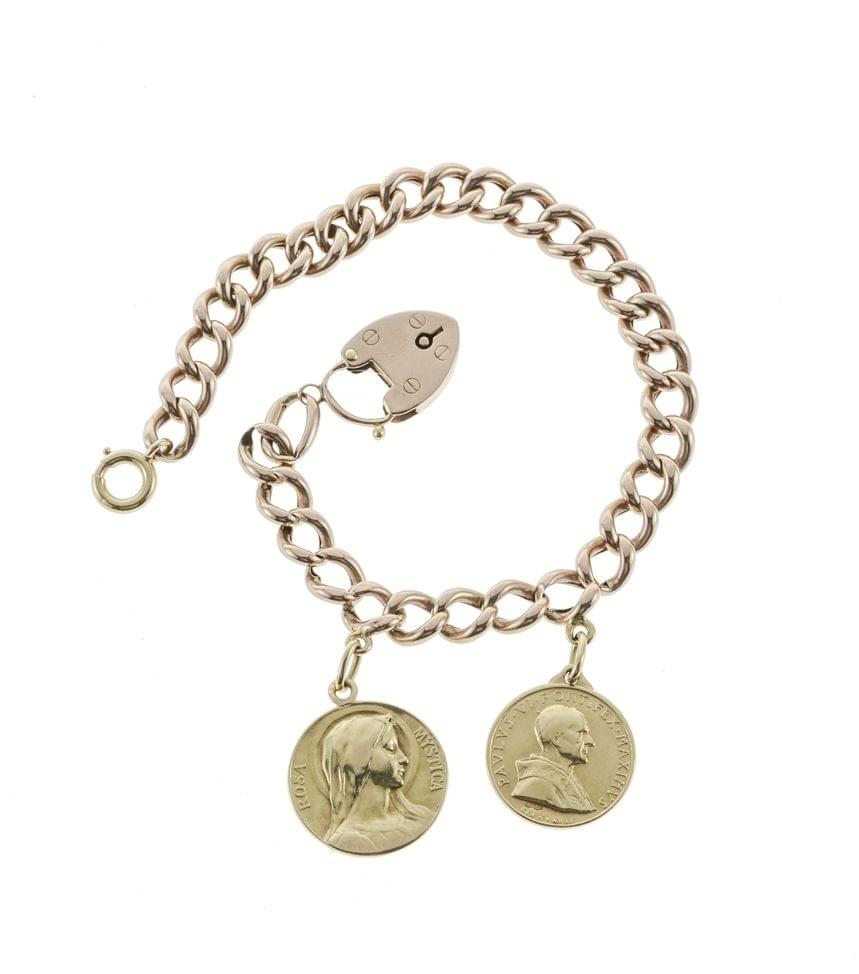 3119. Bracelet à maille gourmette retenant deux médailles de baptême et un pendentif cadenas